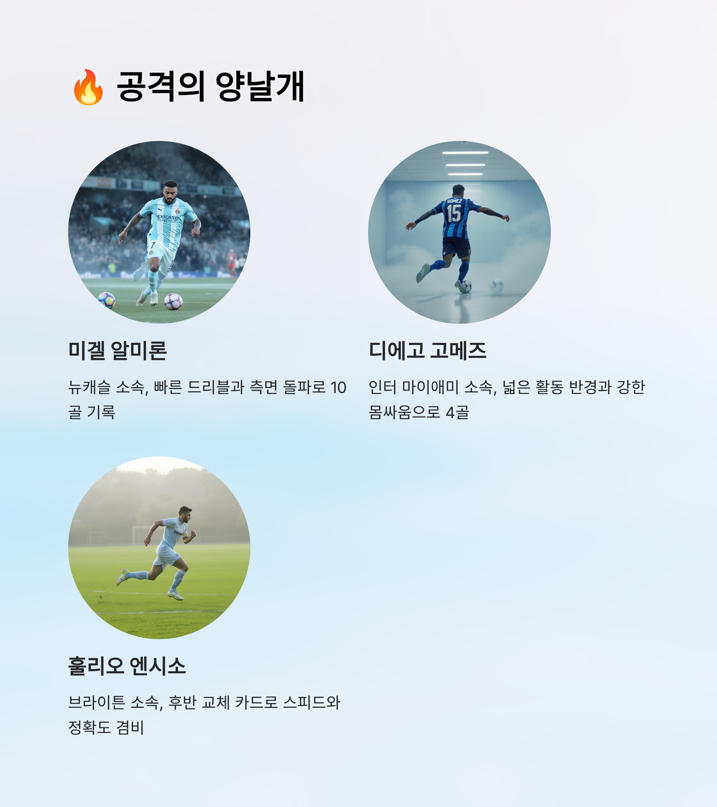 또한, 젊은 공격 자원으로는 훌리오 엔시소(브라이튼)가 있어요. 그는 주로 후반 교체 카드로 활용되며, 상대 수비가 지친 시점에 빠르게 돌파하는 역할을 맡아요. 스피드와 킥 정확도를 겸비한 유망주죠.