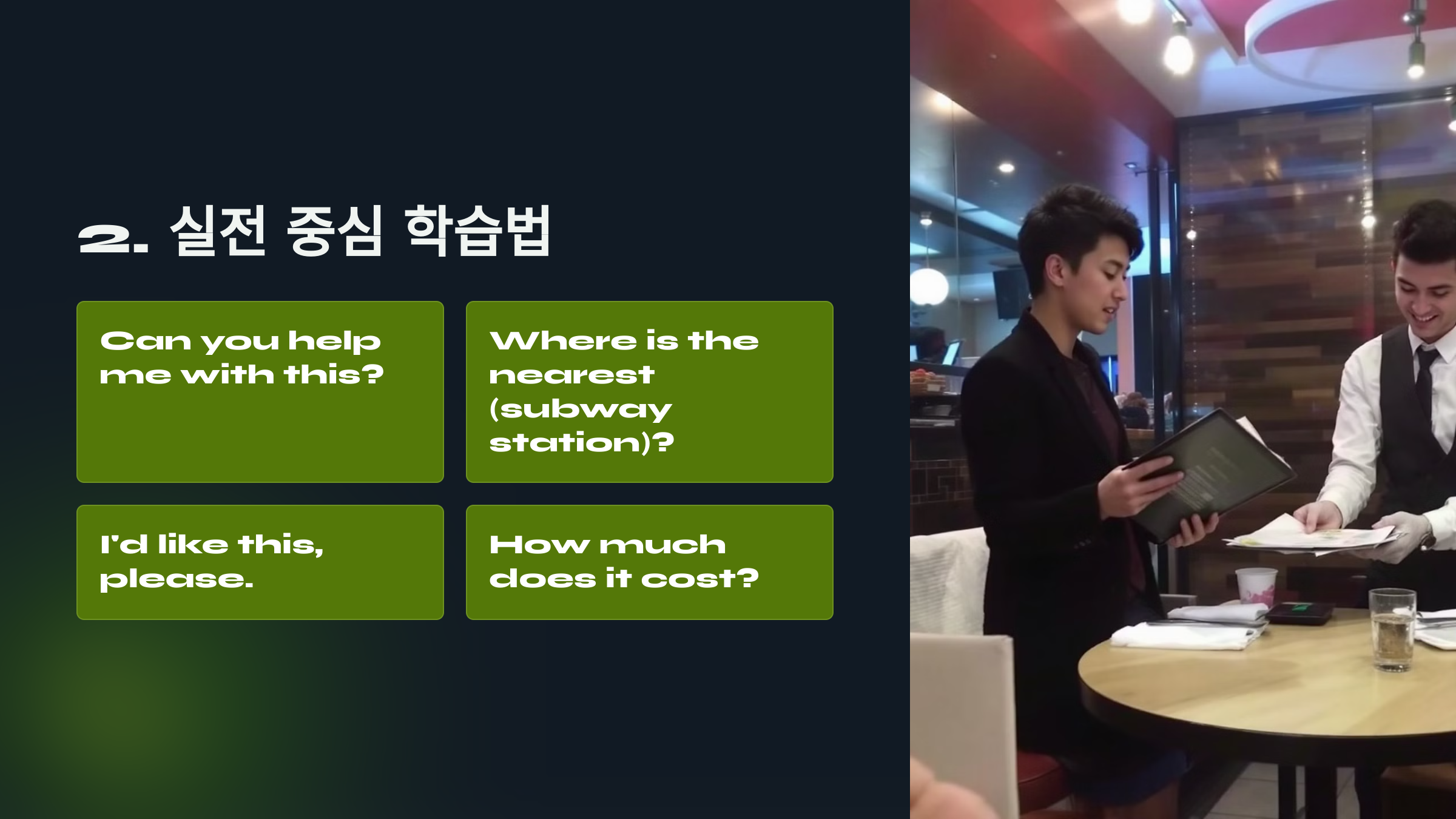 2. 실전 중심 학습법: "사용할 영어만 배우자!" 💬