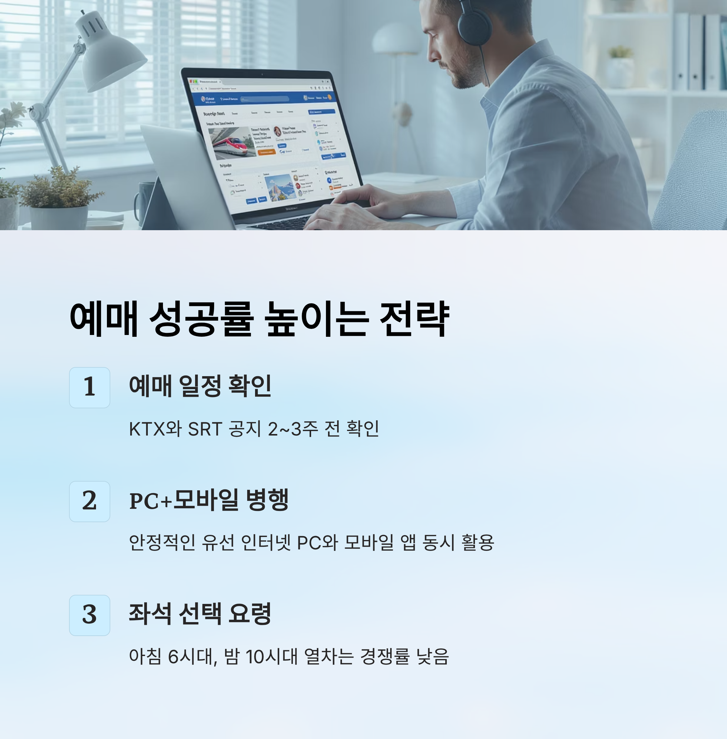 세 번째는 좌석 선택 요령이에요. 많은 사람들이 창가 좌석이나 특정 인기 시간대를 먼저 선택하기 때문에 금방 동이 나요. 하지만 중간 시간대나 조금 덜 선호되는 객차는 남아 있는 경우가 많아요. 예를 들어 아침 6시대, 밤 10시대 열차는 경쟁률이 상대적으로 낮아 확보 가능성이 커요.