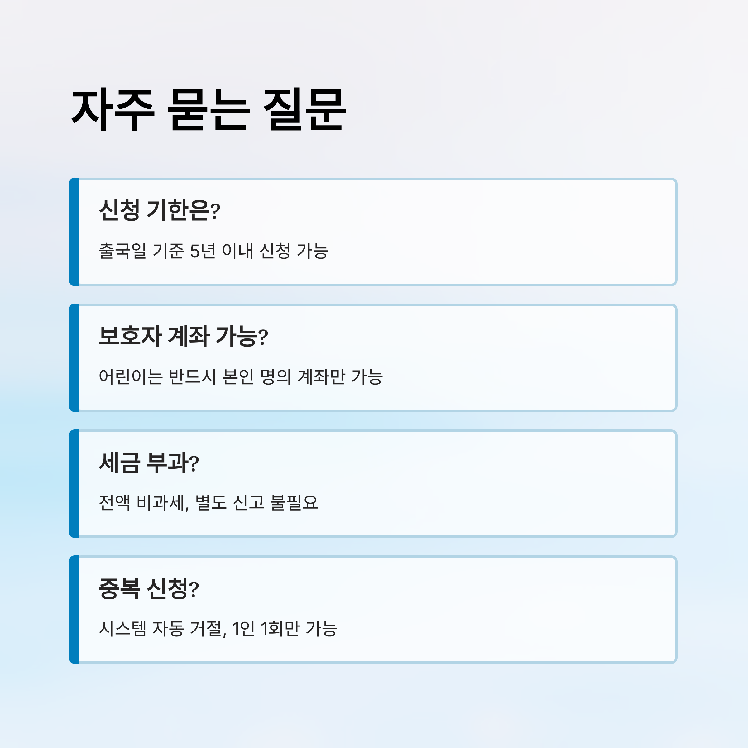 계좌가 없을 경우 보호자 명의 환급은 불가하니, 어린이 통장을 하나 만들어 두는 걸 추천해요. 은행마다 아동 명의 통장 개설이 가능하니 미리 준비하면 수월해요.