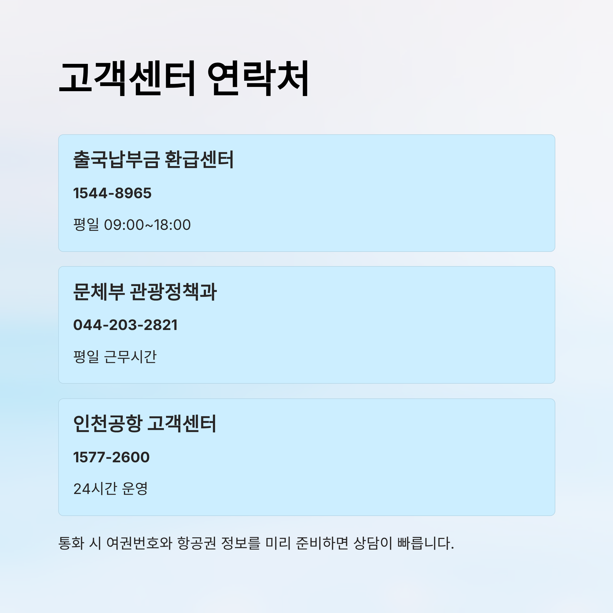 출국납부금 환급센터 | 1544-8965 | 평일 09:00 ~ 18:00 |