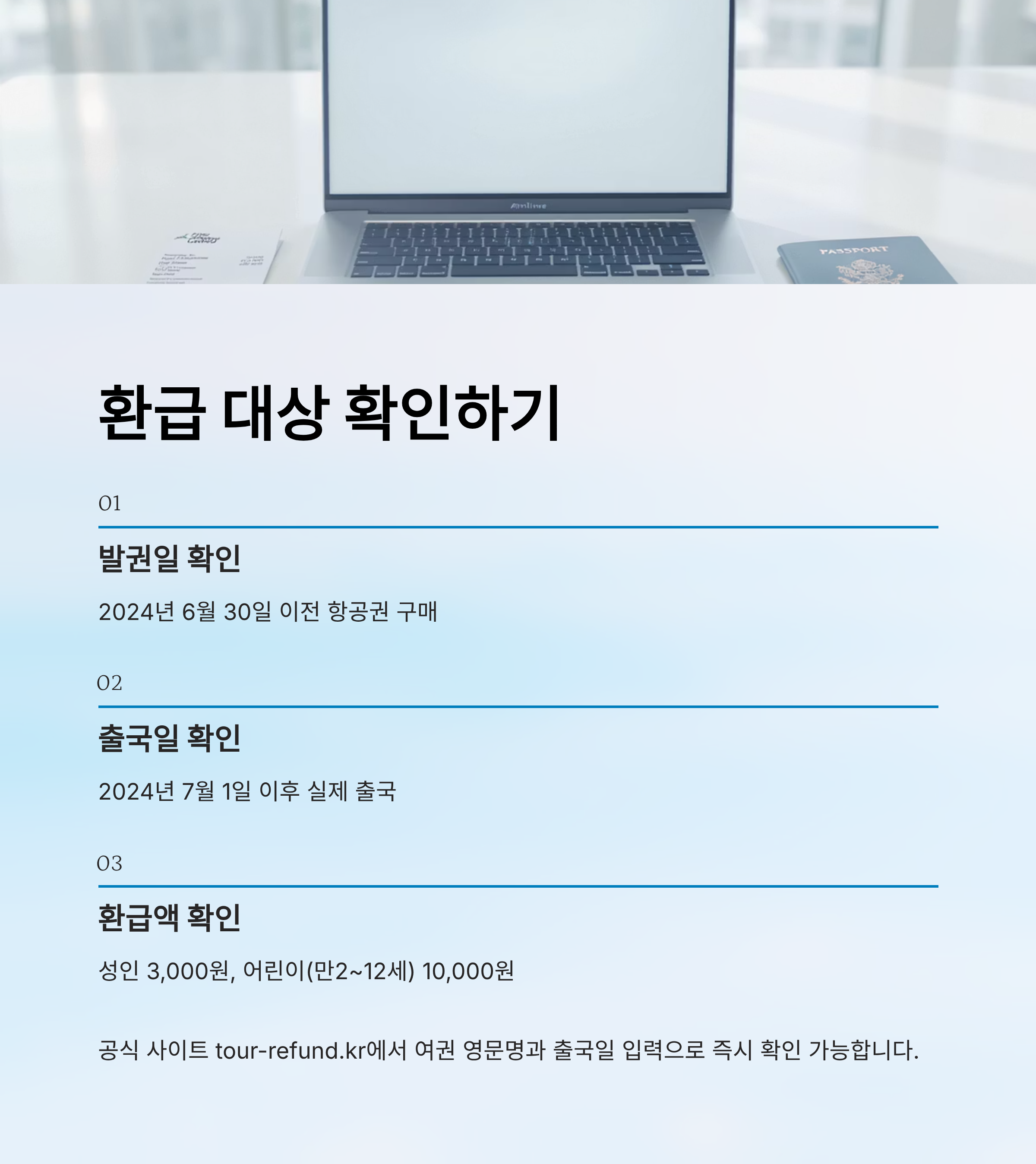출국납부금 환급을 받을 수 있는지 확인하려면 먼저 항공권 발권일과 출국일을 체크해야 해요. 기준은 다음과 같아요: 2024년 6월 30일 이전에 발권했고, 2024년 7월 1일 이후에 출국한 사람이면 환급 대상이에요.