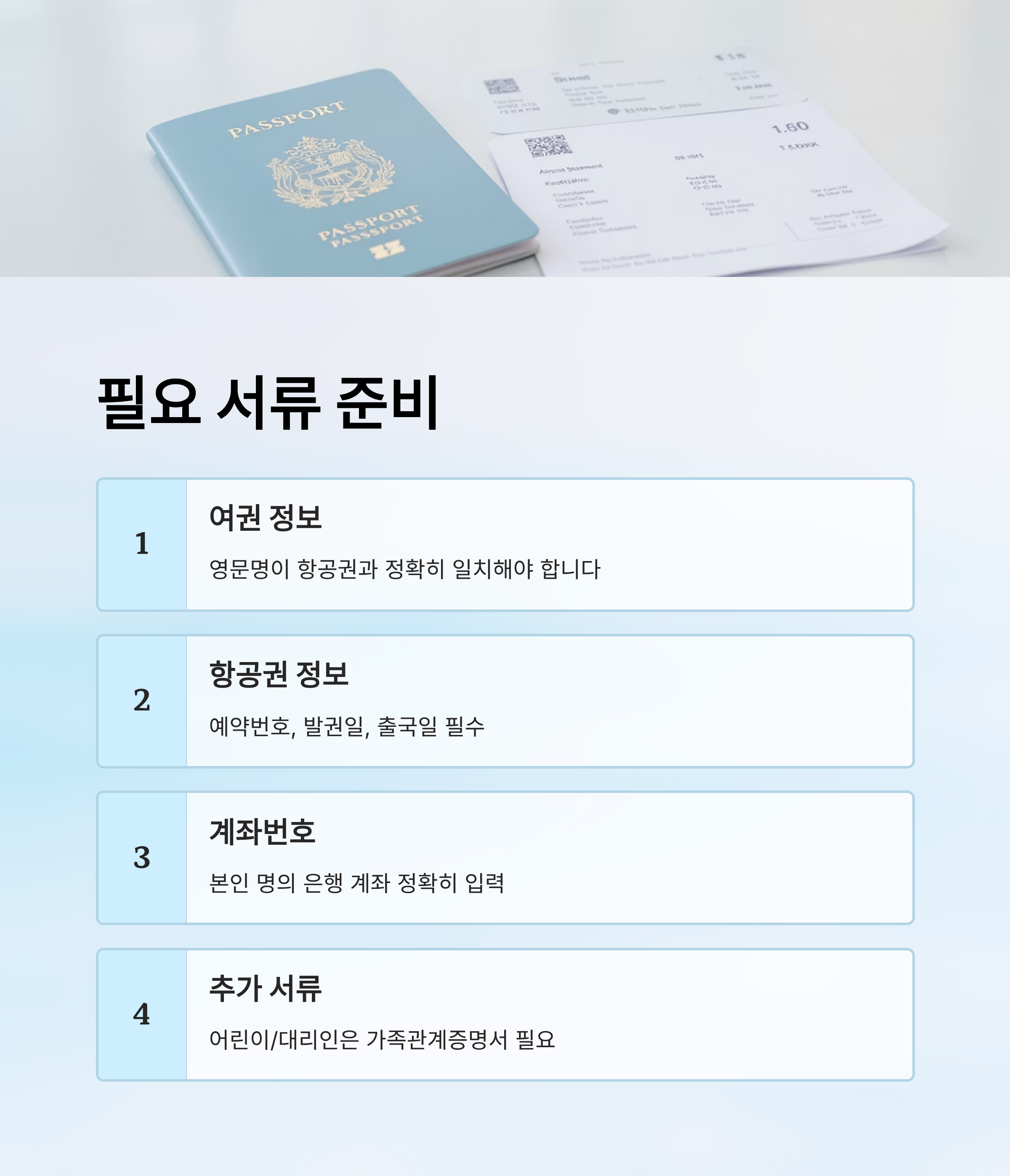 이럴 때 필요한 서류는 상황에 따라 달라지는데, 공통적으로는 본인 확인이 가능한 신분증 사본과 항공권 예약 내역이 요구돼요. 해외 거주자일 경우 추가로 해외 거주 증명서류도 필요할 수 있어요.