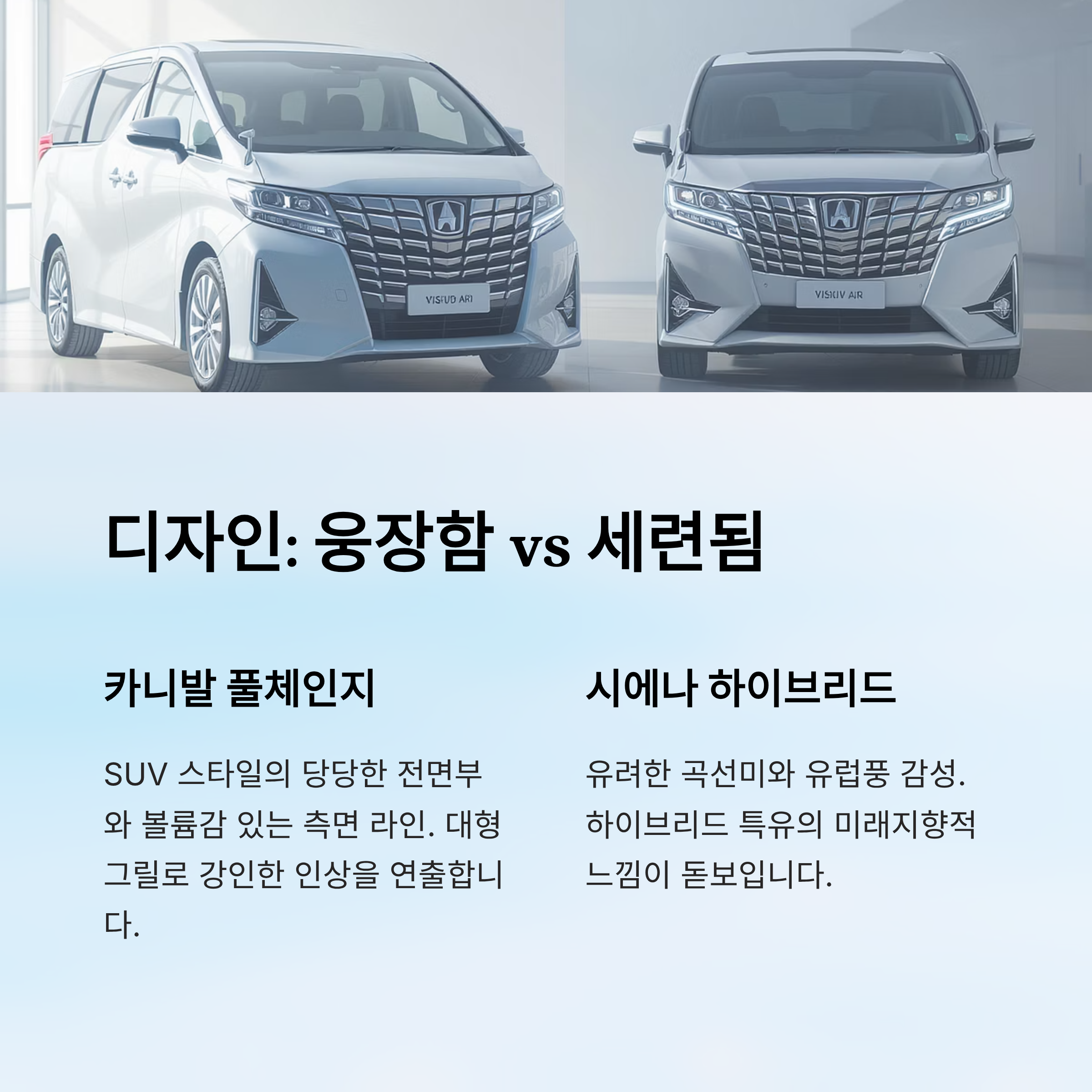내가 생각했을 때, 디자인적으로 카니발은 외형에 있어서 고급감과 가족 중심의 실용성이 조화롭게 어우러져 있고, 시에나는 감성적이고 하이브리드다운 조용한 이미지를 잘 담아낸 느낌이에요.