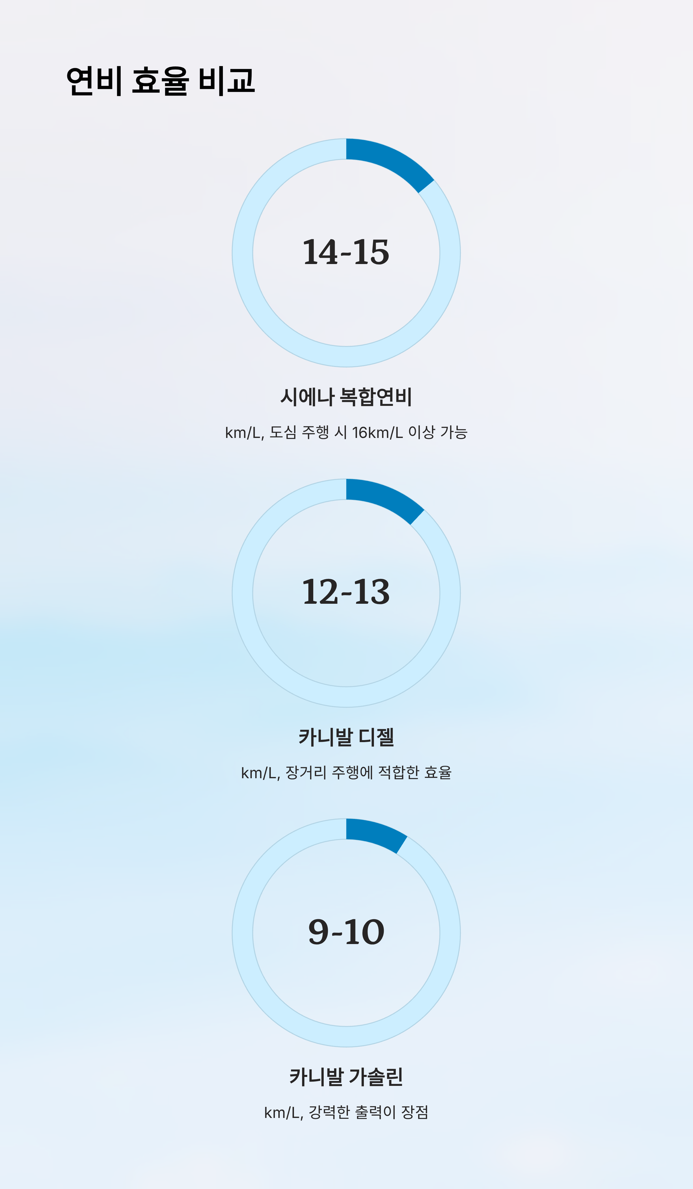 연비는 하이브리드 특유의 장점이 뚜렷해요. 시에나 하이브리드는 복합 14~15km/L, 도심 주행은 16km/L 이상도 가능하고, 카니발 디젤은 평균 12~13km/L, 가솔린은 9~10km/L 수준이에요. 연간 주행거리가 많다면 연비에서 시에나가 훨씬 경제적이에요.