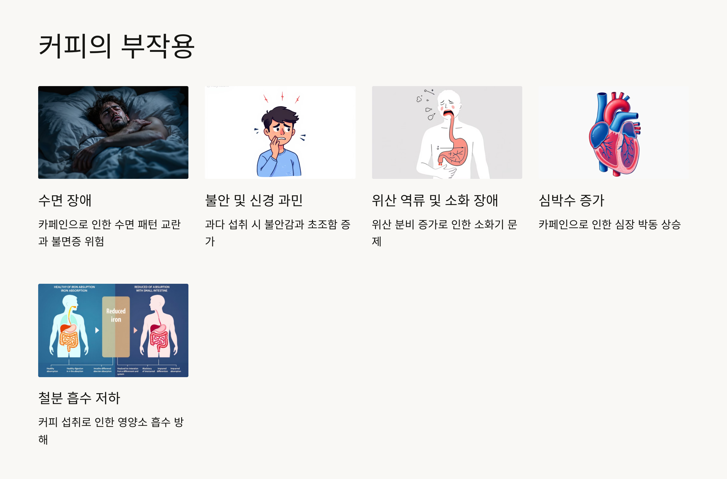 아무리 좋은 커피라도 과도하게 섭취하면 부작용이 발생할 수 있습니다. 아래는 커피의 대표적인 부작용입니다.