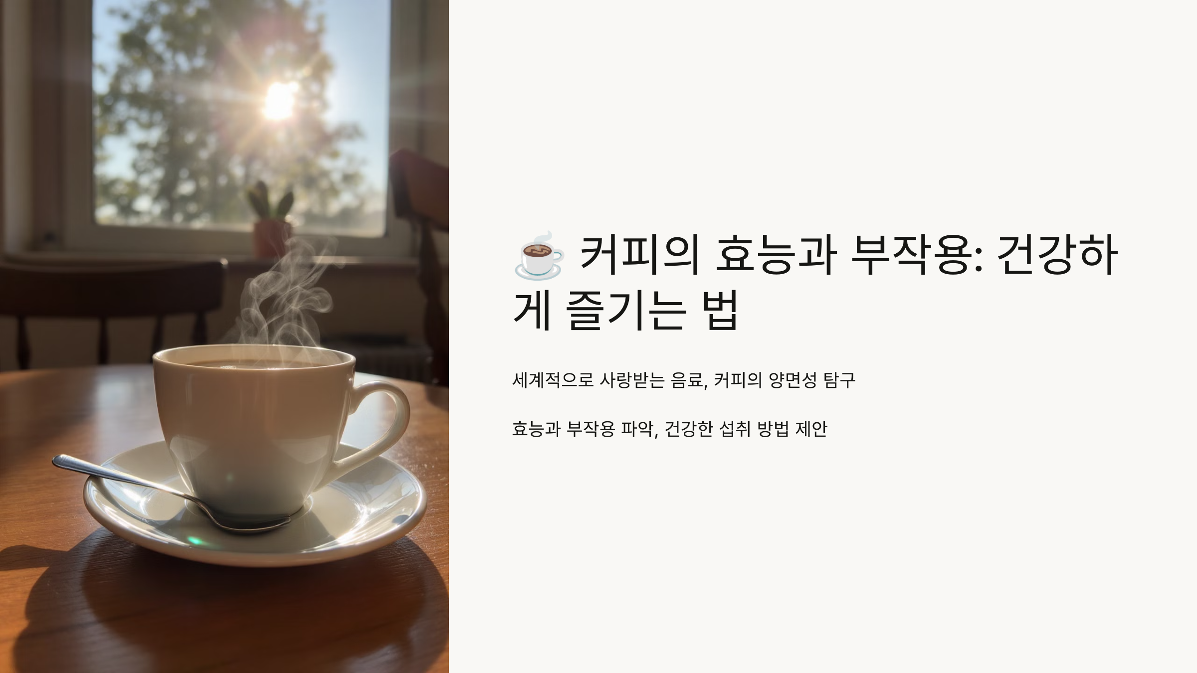 커피는 그 효능만큼이나 부작용도 존재하는 음료입니다. 하지만 적절한 섭취 방법을 따르면 커피는 건강한 일상 속 동반자가 될 수 있습니다. 오늘부터 커피를 더 건강하게 즐기며 활기찬 하루를 만들어보세요. 😊 "커피는 나의 작은 사치"라는 말처럼, 건강한 습관 속에서 커피 한 잔의 여유를 즐겨보세요!