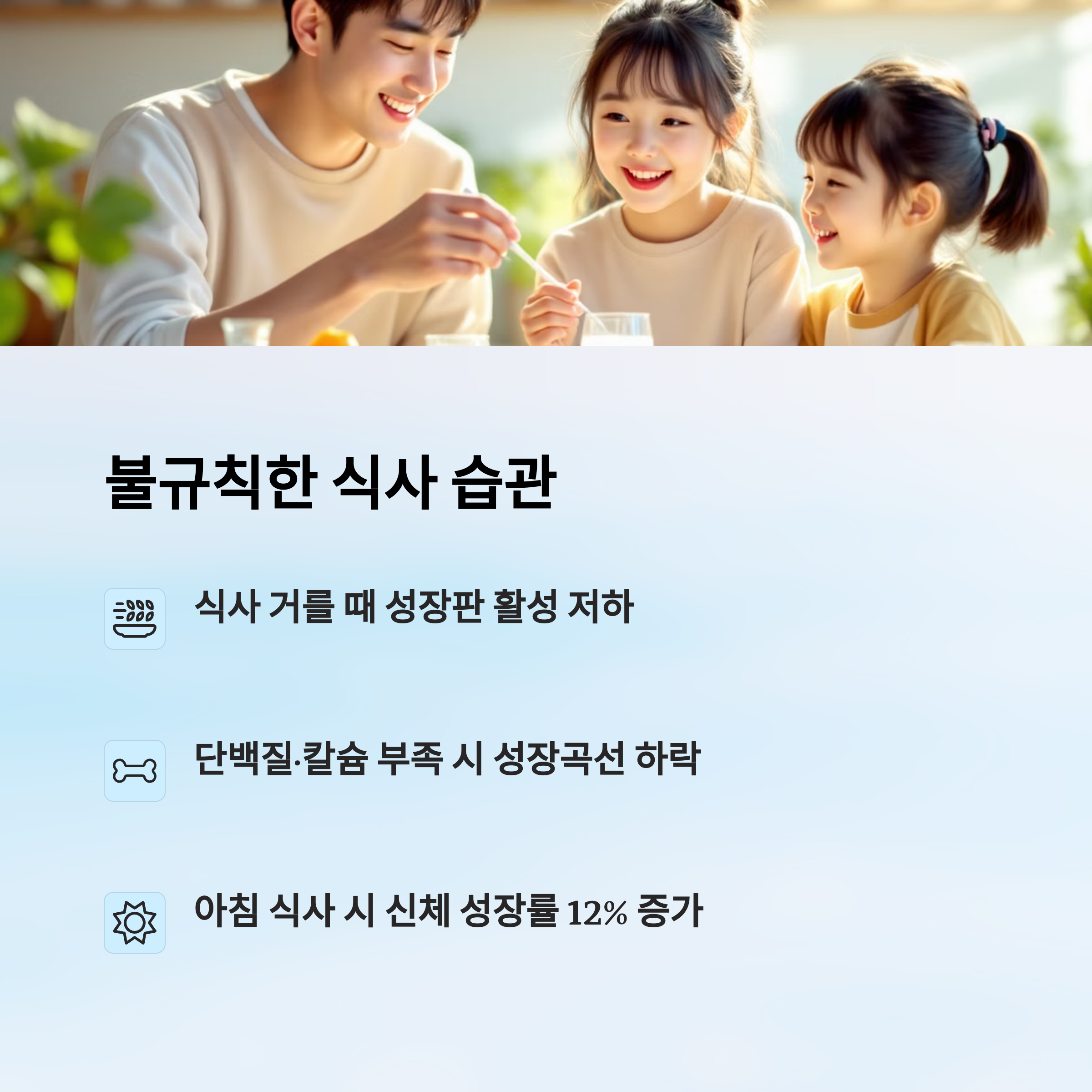 식사는 단순히 배를 채우는 행위가 아니에요. 아이의 뼈와 근육을 만들어주는 ‘건축 자재’이자, 성장판에 에너지를 공급해주는 ‘연료’예요. 그런데 이 식사를 거르거나 편식하게 되면, 성장의 기회 자체가 줄어들 수밖에 없어요.