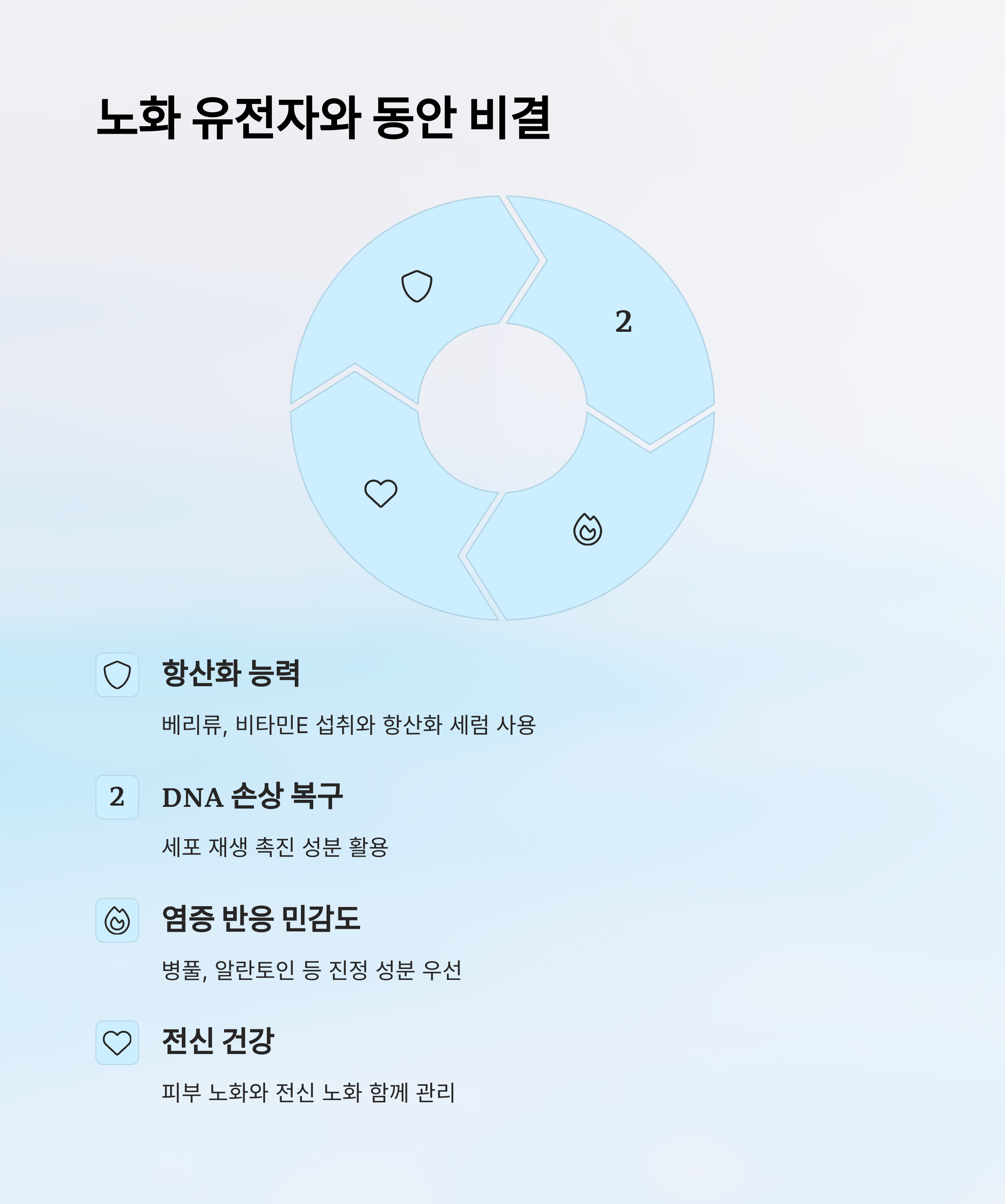 또한 염증 반응 유전자가 예민하다면, 피부에 자극이 가는 제품은 피하고, 진정 성분(병풀, 알란토인 등)을 우선 고려해야 해요. 이처럼 유전자를 알고 나면, 동안 피부 만들기가 훨씬 수월해져요.