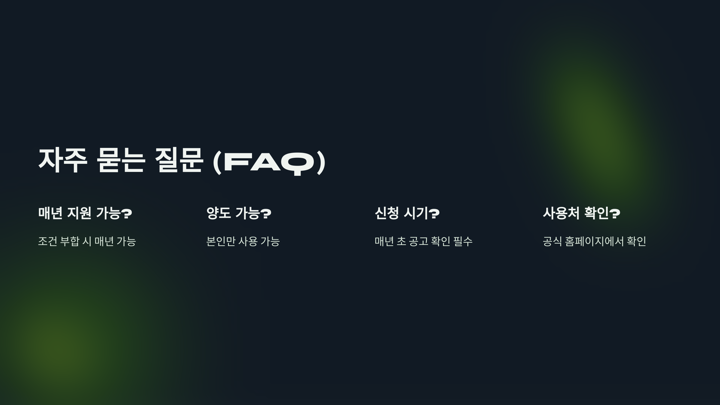 A3: 다음 신청 기간까지 기다려야 하므로, 매년 초 공고를 꼭 확인하세요.