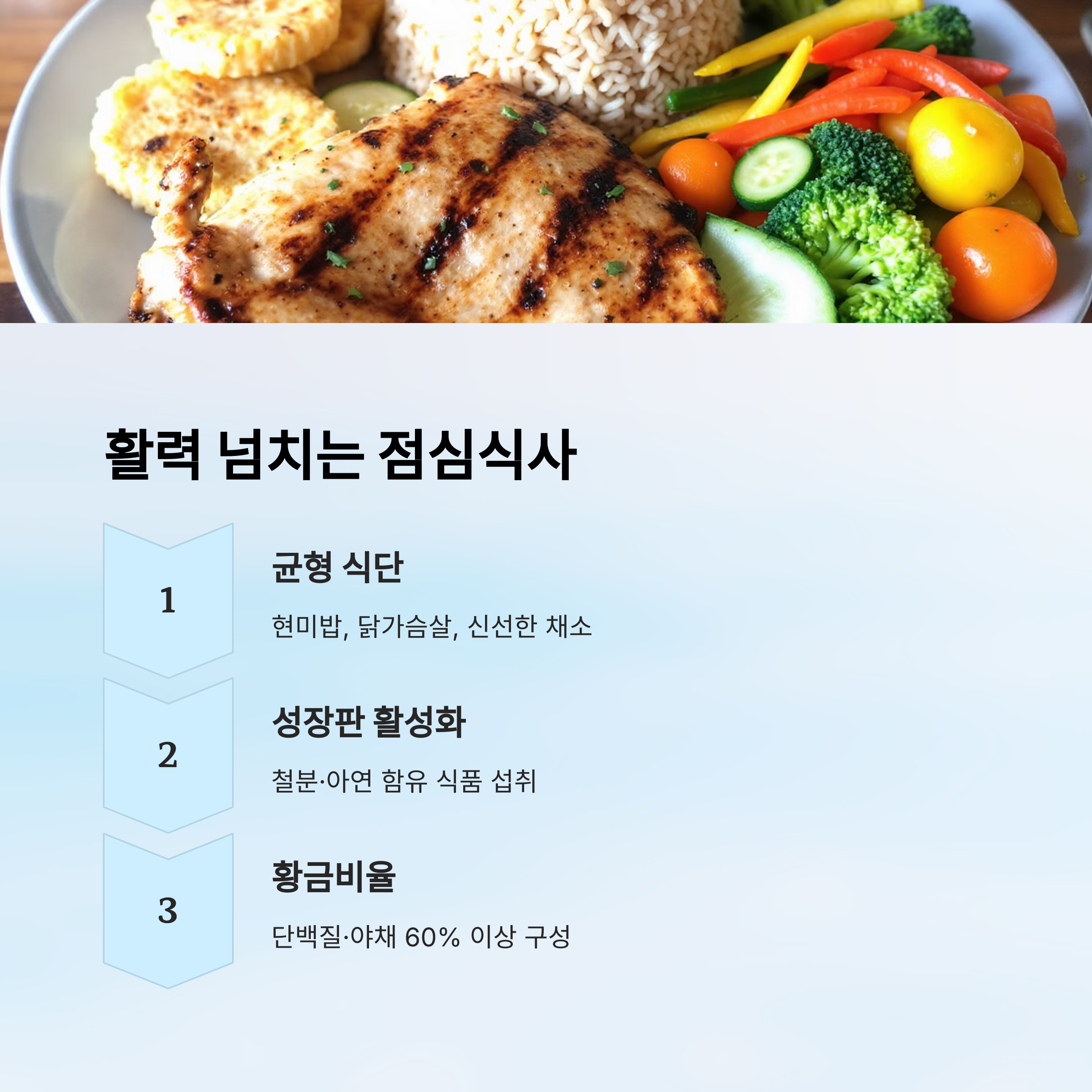 점심은 보통 학교 급식으로 해결되는 경우가 많지만, 급식 메뉴가 편향되거나 가공식품 위주일 수 있어요. 이럴 땐 가정에서 아침이나 저녁으로 부족한 영양소를 보충해 주는 식단 설계가 필요해요.