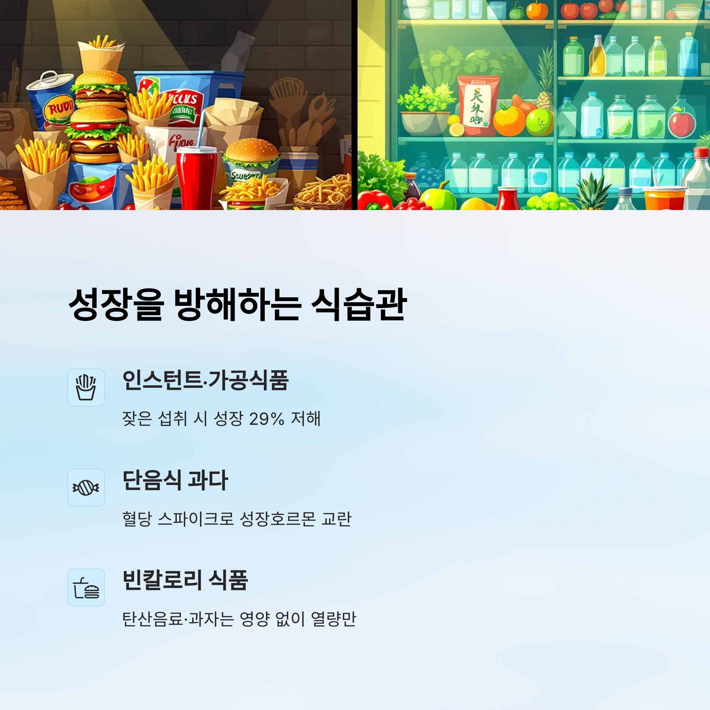 대표적으로 탄산음료는 칼슘의 흡수를 방해하고, 지나친 당 섭취는 성장호르몬 분비를 억제해요. 또한 인스턴트 라면이나 스낵은 나트륨과 포화지방이 많아 몸의 균형을 깨뜨리고 성장에 방해가 될 수 있어요.