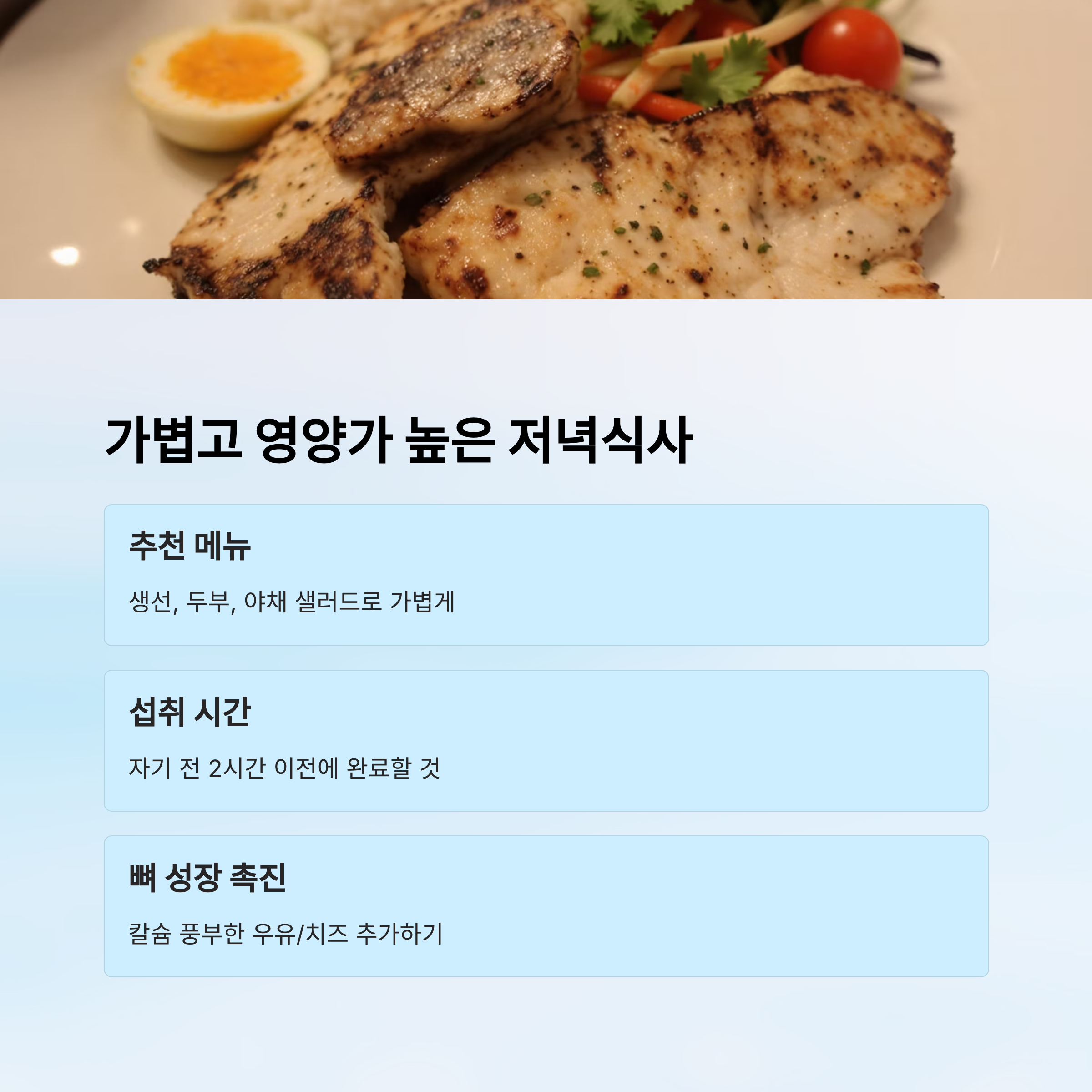 따라서 저녁 식사는 ‘가볍지만 영양 있는’ 식단을 지향해야 해요. 예를 들어, 닭가슴살 샐러드, 두부조림, 미역국, 고구마 정도면 충분히 성장에 필요한 영양소를 챙길 수 있고, 위에 부담도 적어요.