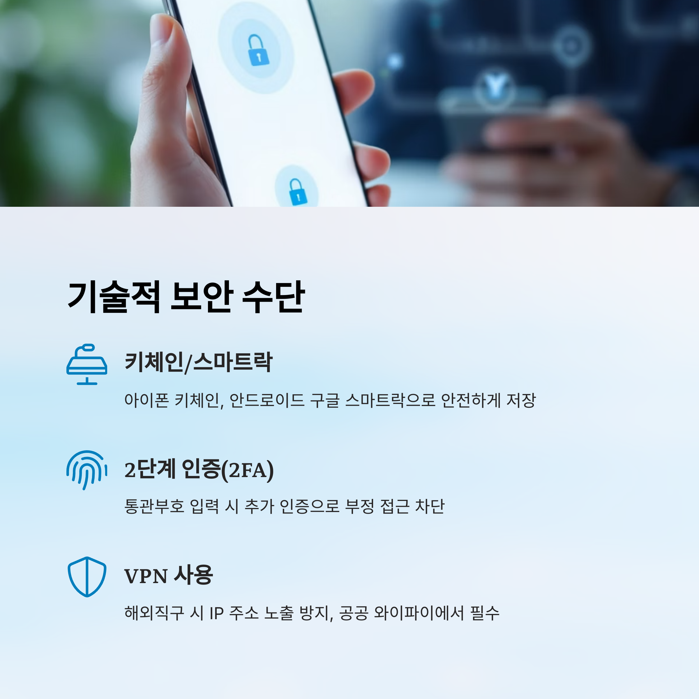 예를 들어 아이폰의 ‘키체인’이나 안드로이드의 ‘구글 스마트락’을 활용하면 비밀번호와 통관부호를 안전하게 저장할 수 있어요. 여기엔 생체인증까지 연동돼 있어, 본인 외에는 절대 접근할 수 없도록 설계됐어요.