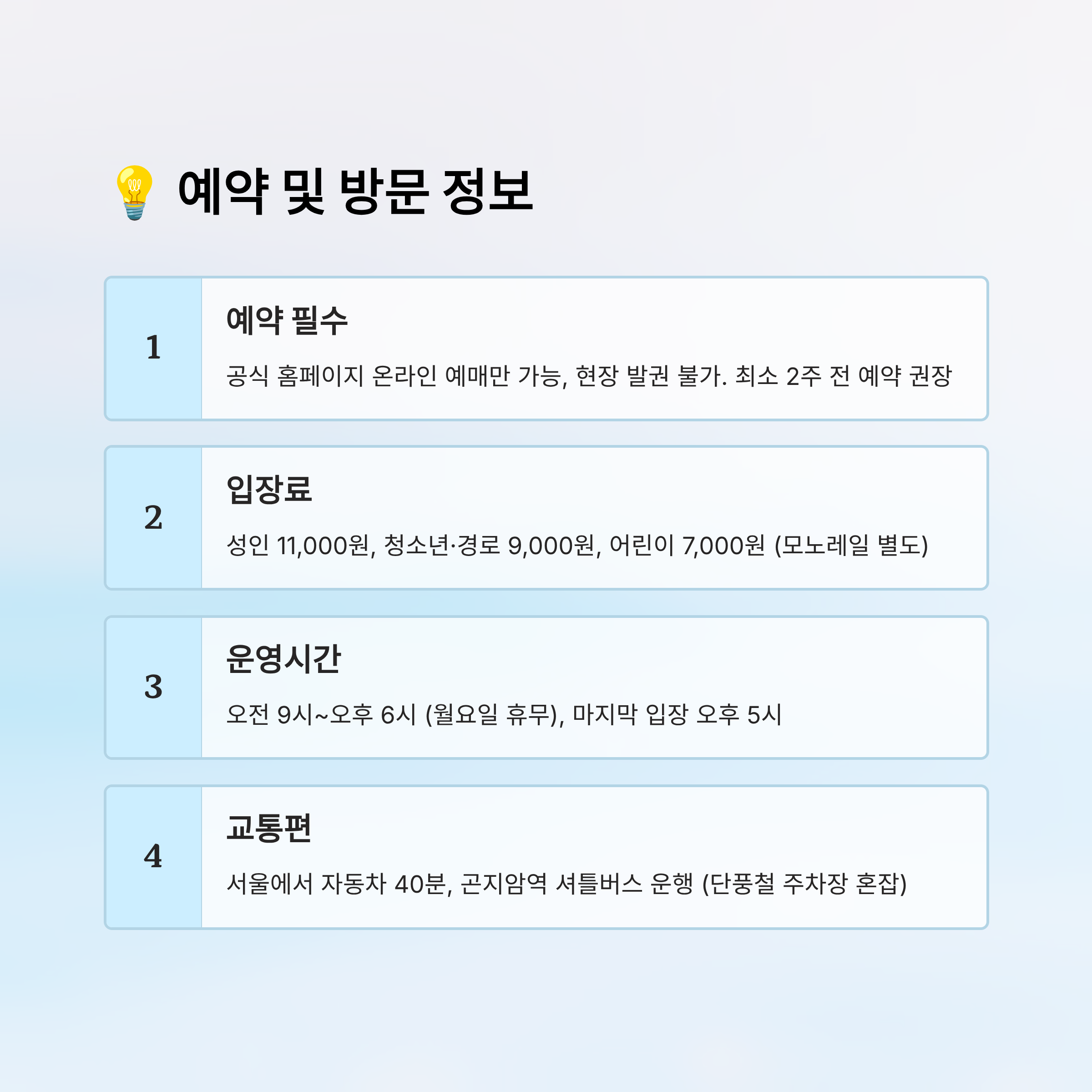 운영 시간은 오전 9시부터 오후 6시까지예요. 마지막 입장은 오후 5시까지 가능하고, 매주 월요일은 휴무라서 방문 계획을 세울 때 꼭 확인해야 해요. 단풍 절정기에는 주차장이 빨리 차기 때문에 대중교통을 이용하거나, 곤지암역에서 운영하는 셔틀버스를 이용하는 것도 좋은 방법이에요.