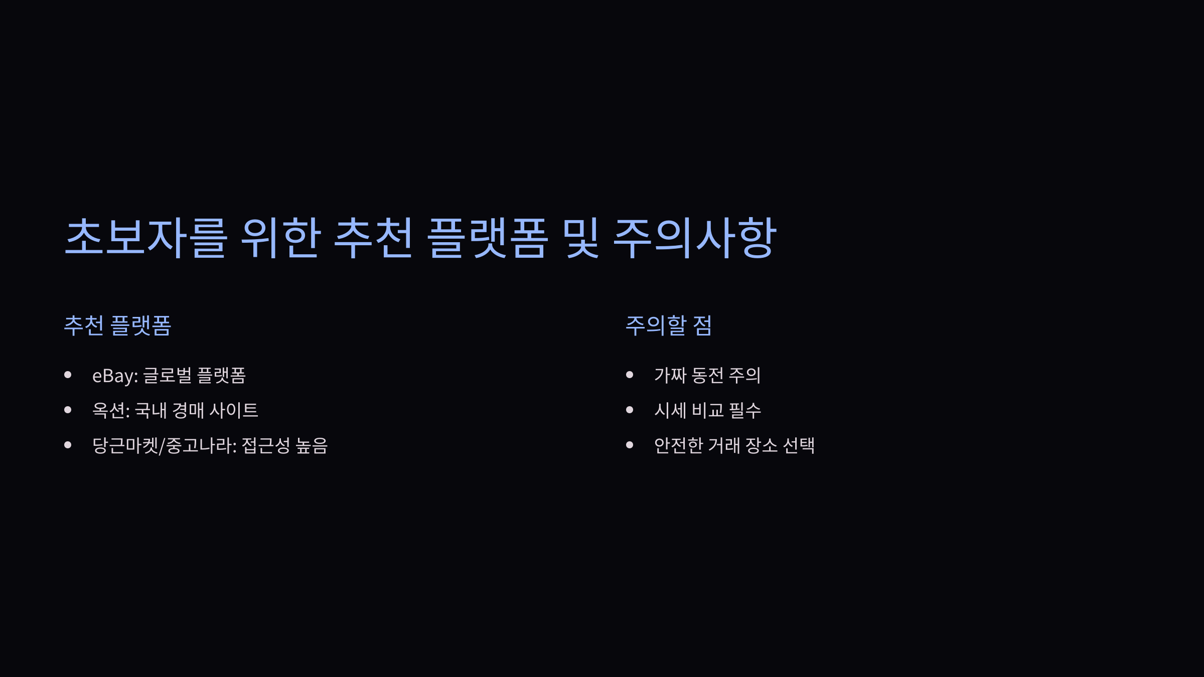 - 당근마켓/중고나라: 초보자도 쉽게 접근 가능한 플랫폼입니다.