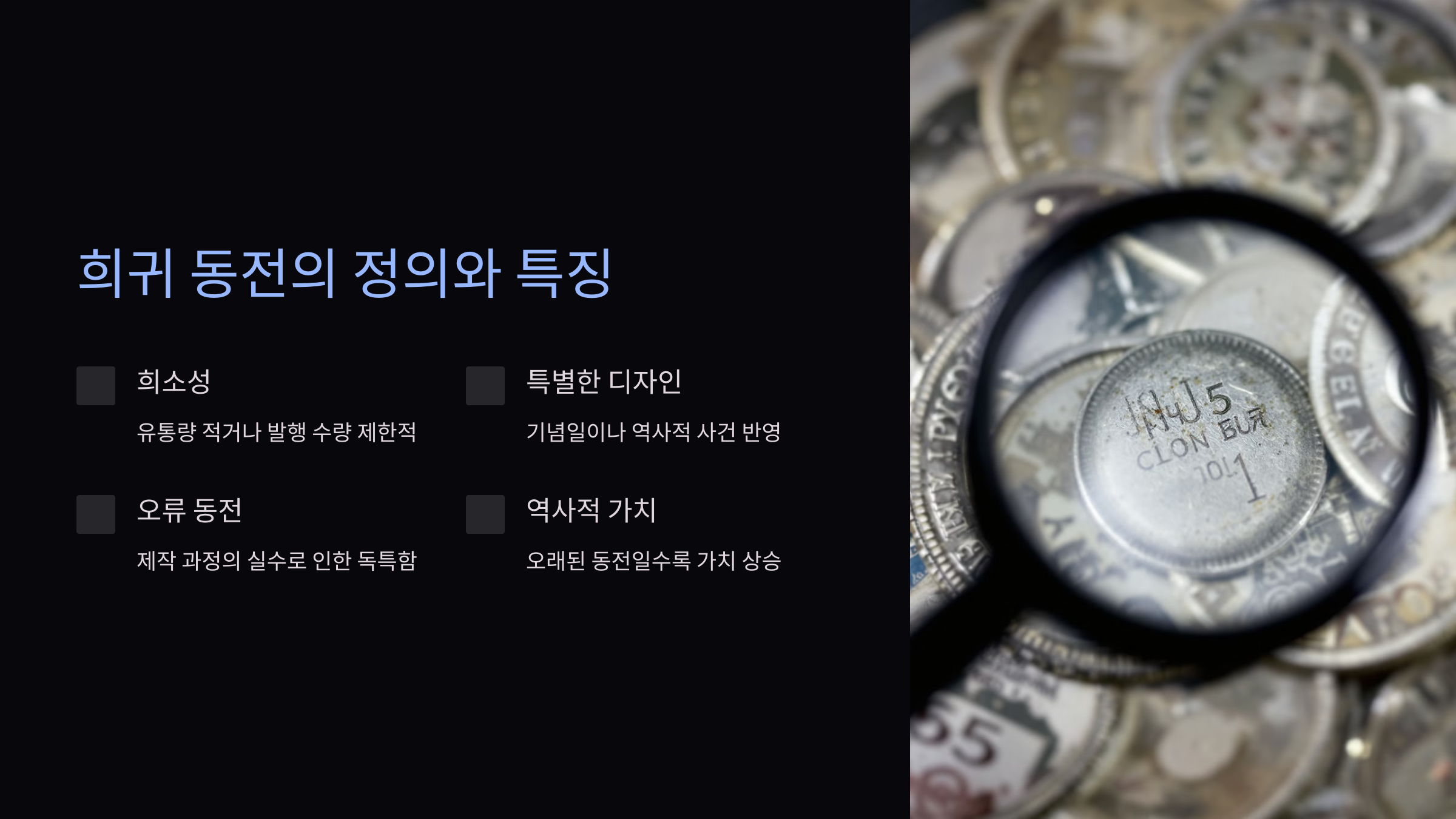 이 동전들은 단순히 수집품으로서의 가치뿐만 아니라, 시간이 지나면서 그 희소성이 더욱 증가해 투자 가치도 함께 높아집니다. 다음은 희귀 동전을 결정짓는 주요 요소들입니다:
