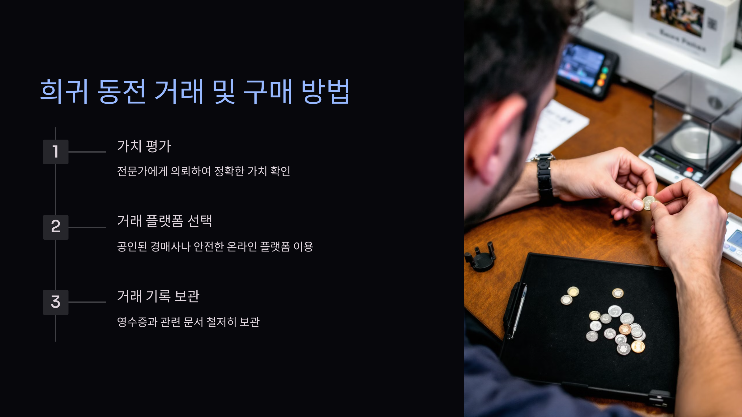 - 가치 평가: 거래 전에 전문가에게 의뢰해 동전의 가치를 평가받습니다.