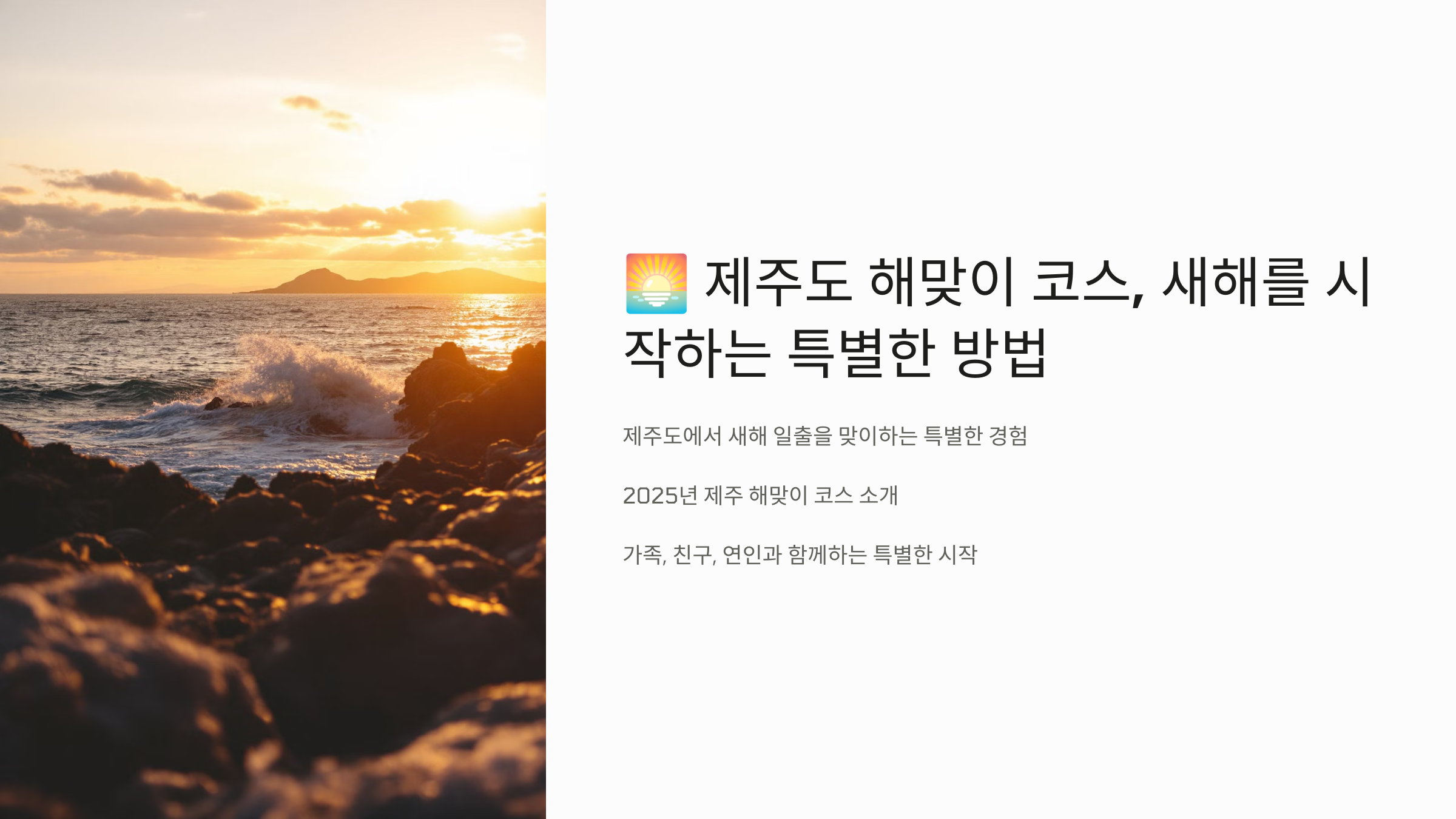 제주도에서 맞이하는 새해 일출은 단순히 해를 보는 것이 아니라 새로운 다짐과 설렘을 느낄 수 있는 특별한 순간입니다. 성산일출봉의 웅장함, 섭지코지의 한적함, 그리고 한라산 정상의 장엄함까지 다양한 매력을 지닌 해맞이 코스를 선택해 2025년을 활기차게 시작해보세요! ✨