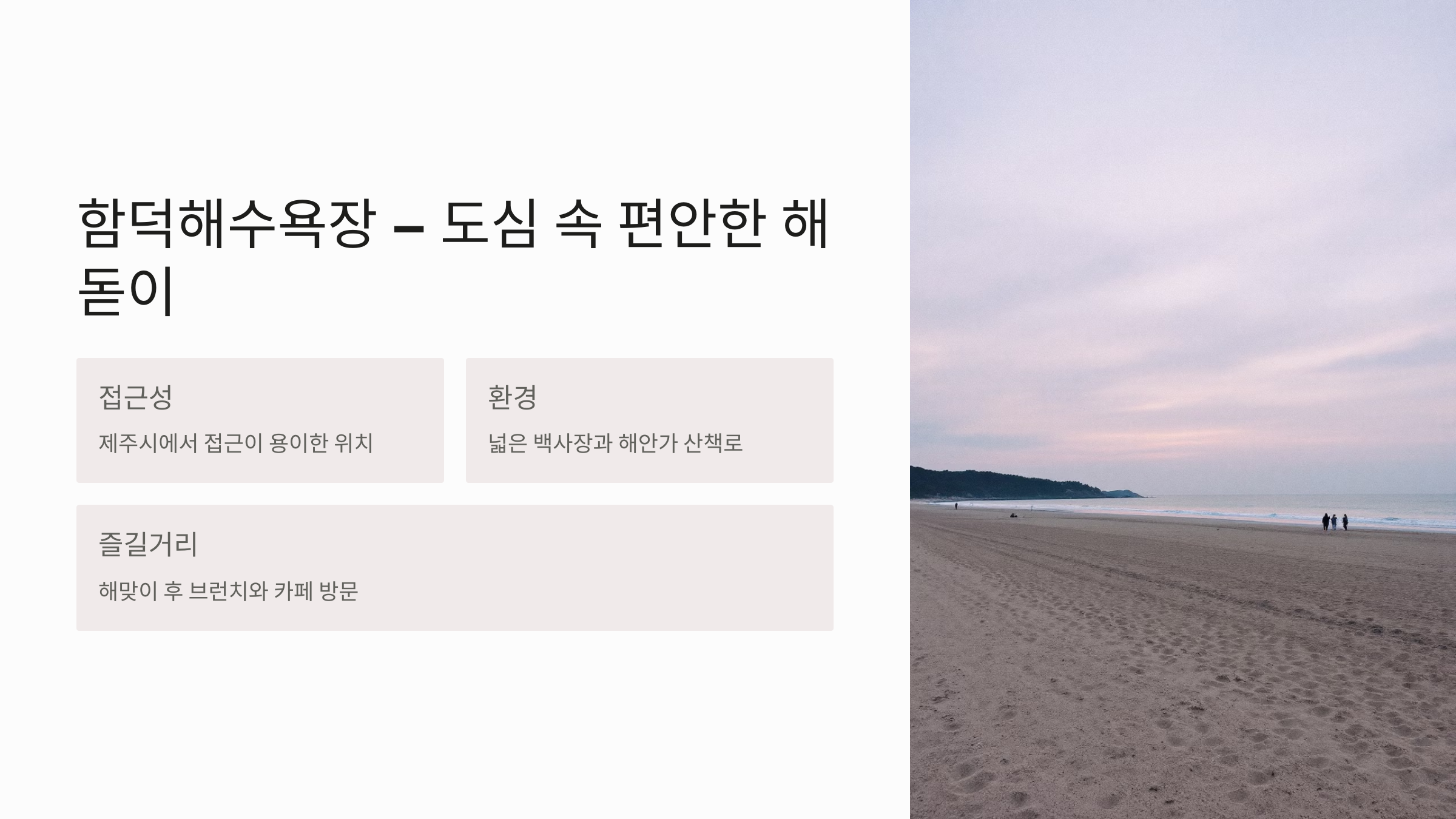 - 추천 포인트: 도심 접근성, 넓고 한적한 백사장