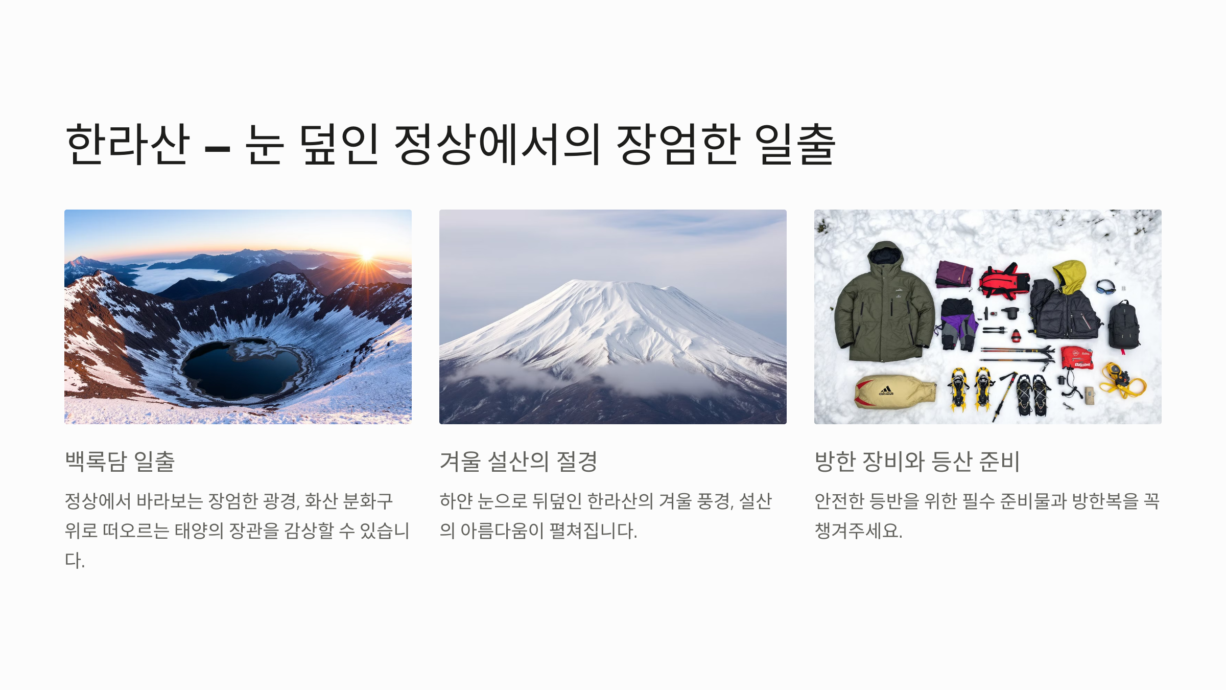 - 추천 포인트: 백록담 일출, 겨울 설산의 절경