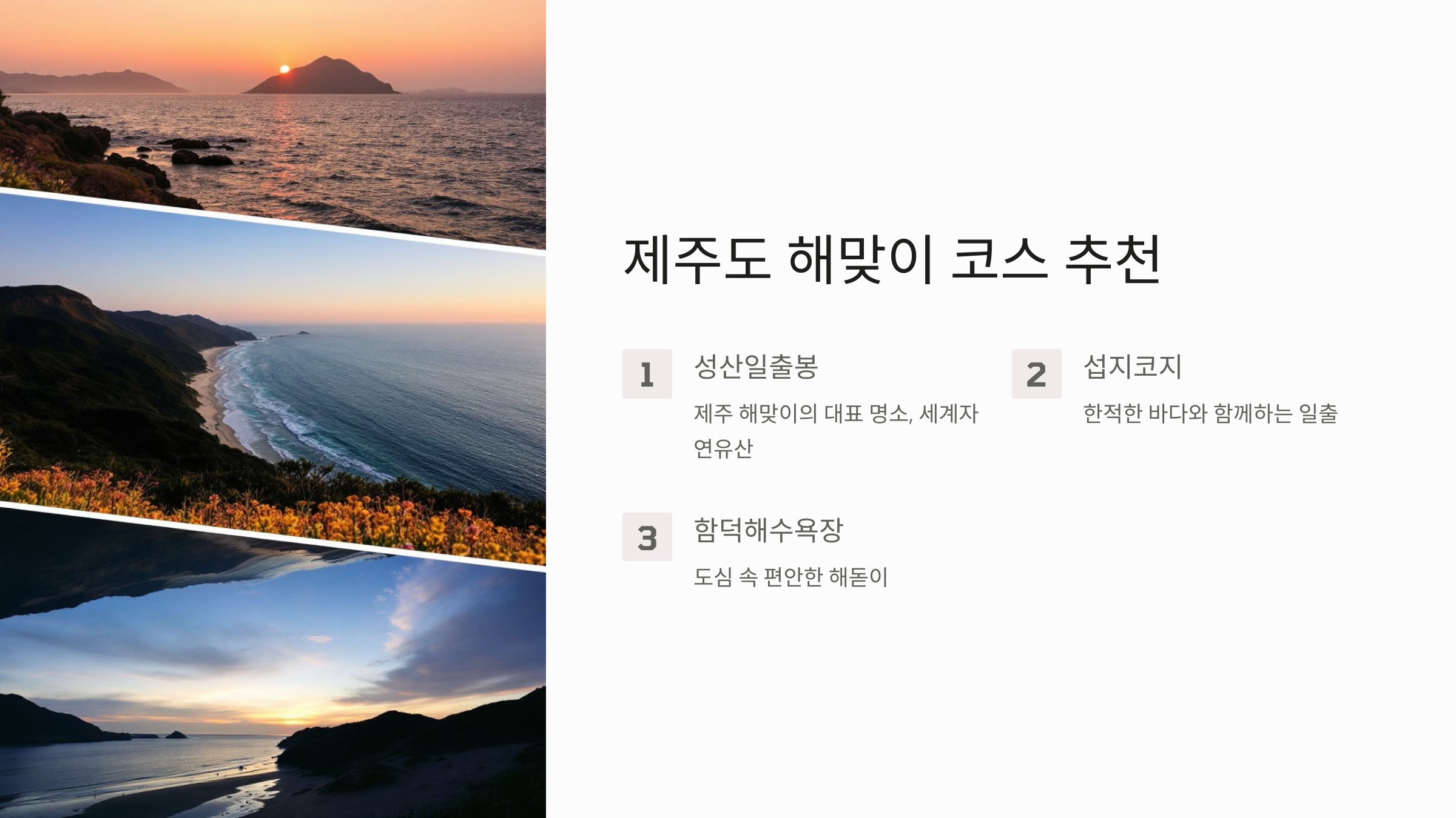 제주시에서 접근성이 좋은 함덕해수욕장은 여유롭게 새해 해돋이를 즐기기에 완벽한 장소입니다. 해안가 산책로와 넓은 백사장이 어우러져 편안한 분위기를 선사하며, 근처 맛집과 카페들도 많아 해맞이 후 브런치를 즐기기에도 좋습니다.
