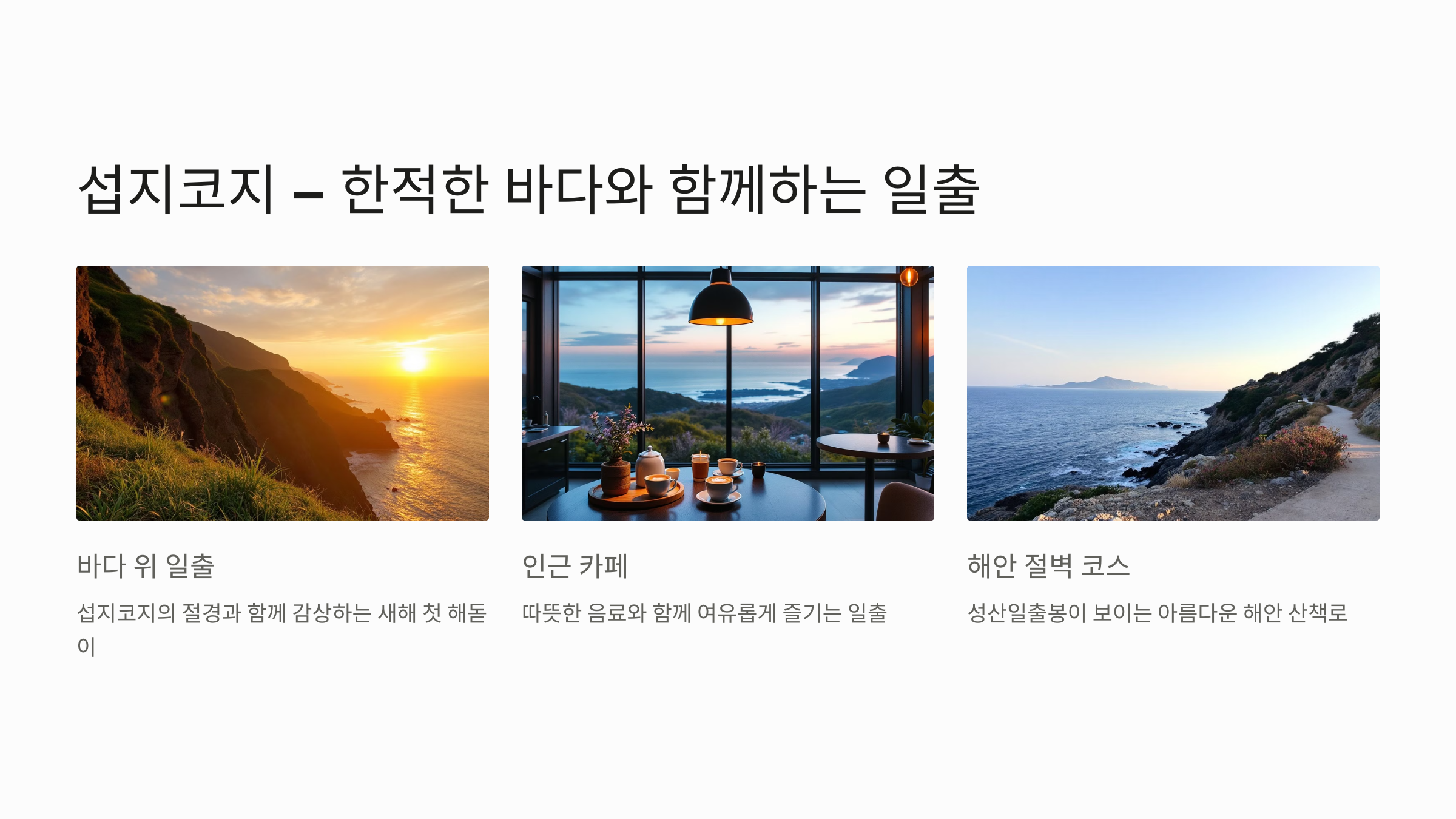 - 팁: 섭지코지 인근 카페에서 따뜻한 음료와 함께 해돋이를 감상해보세요. 🌊