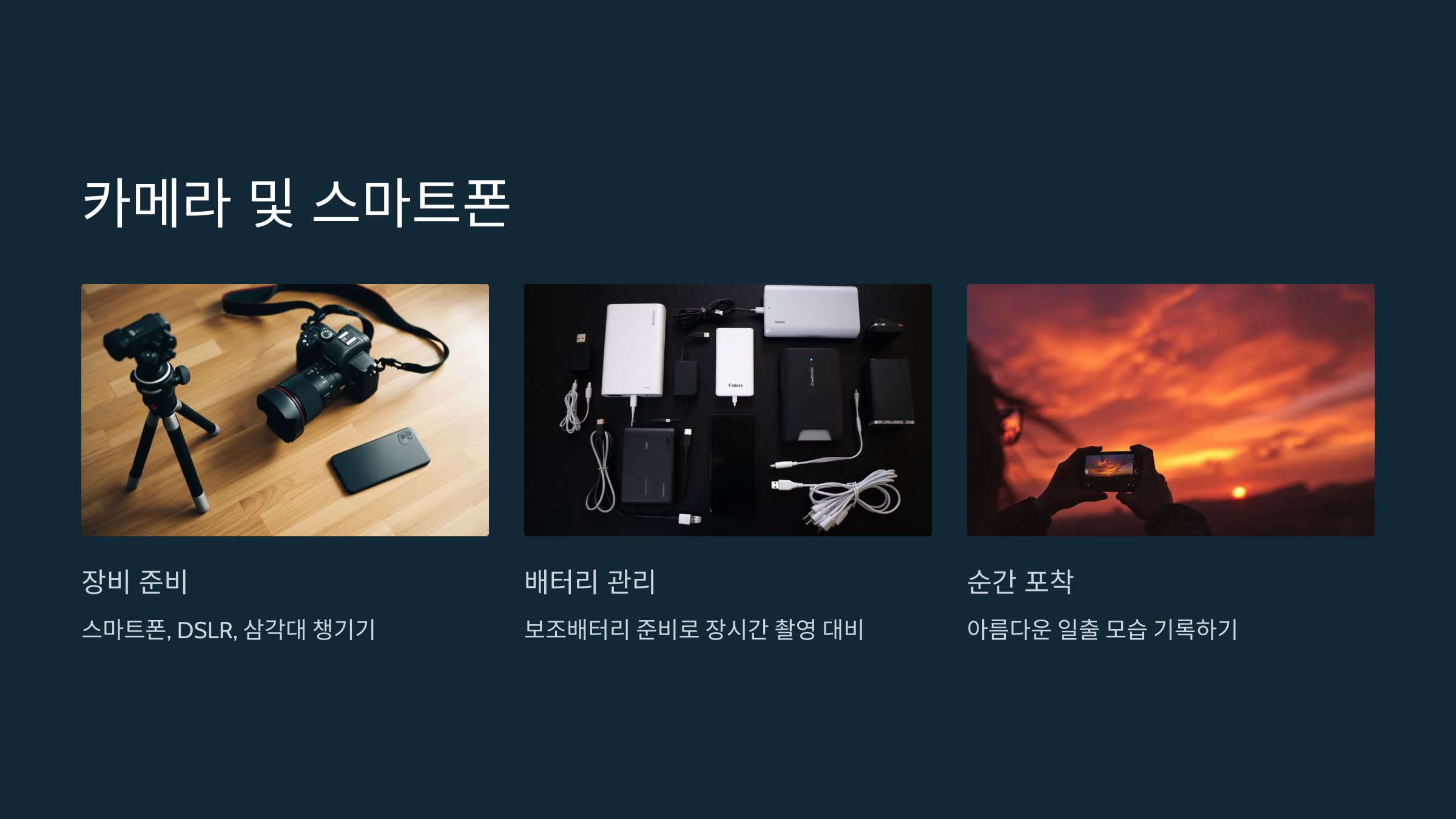 - 필수 아이템: 스마트폰, DSLR, 삼각대