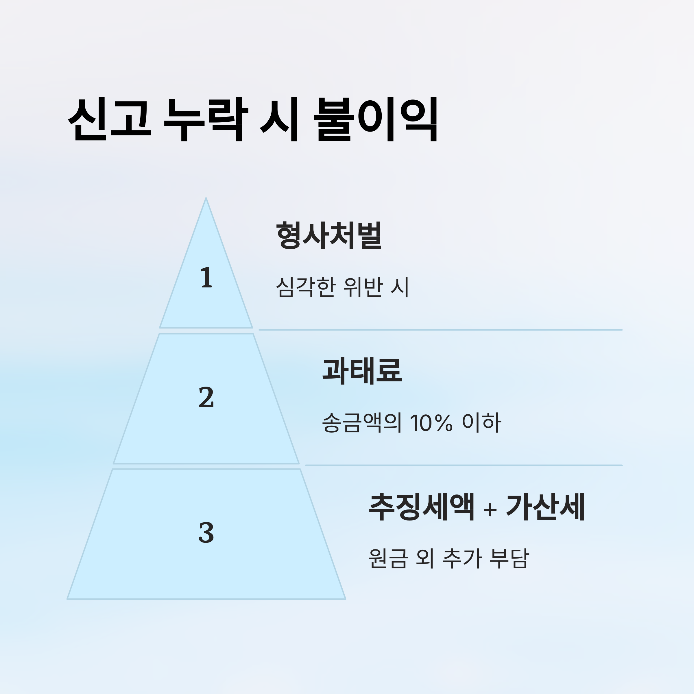 해외 송금과 관련해 가장 조심해야 할 부분 중 하나는 바로 신고 누락이에요. 단순한 실수라고 해도, 국세청에서는 고의 누락으로 판단할 수 있고 그에 따른 과태료와 가산세가 부과될 수 있어요.