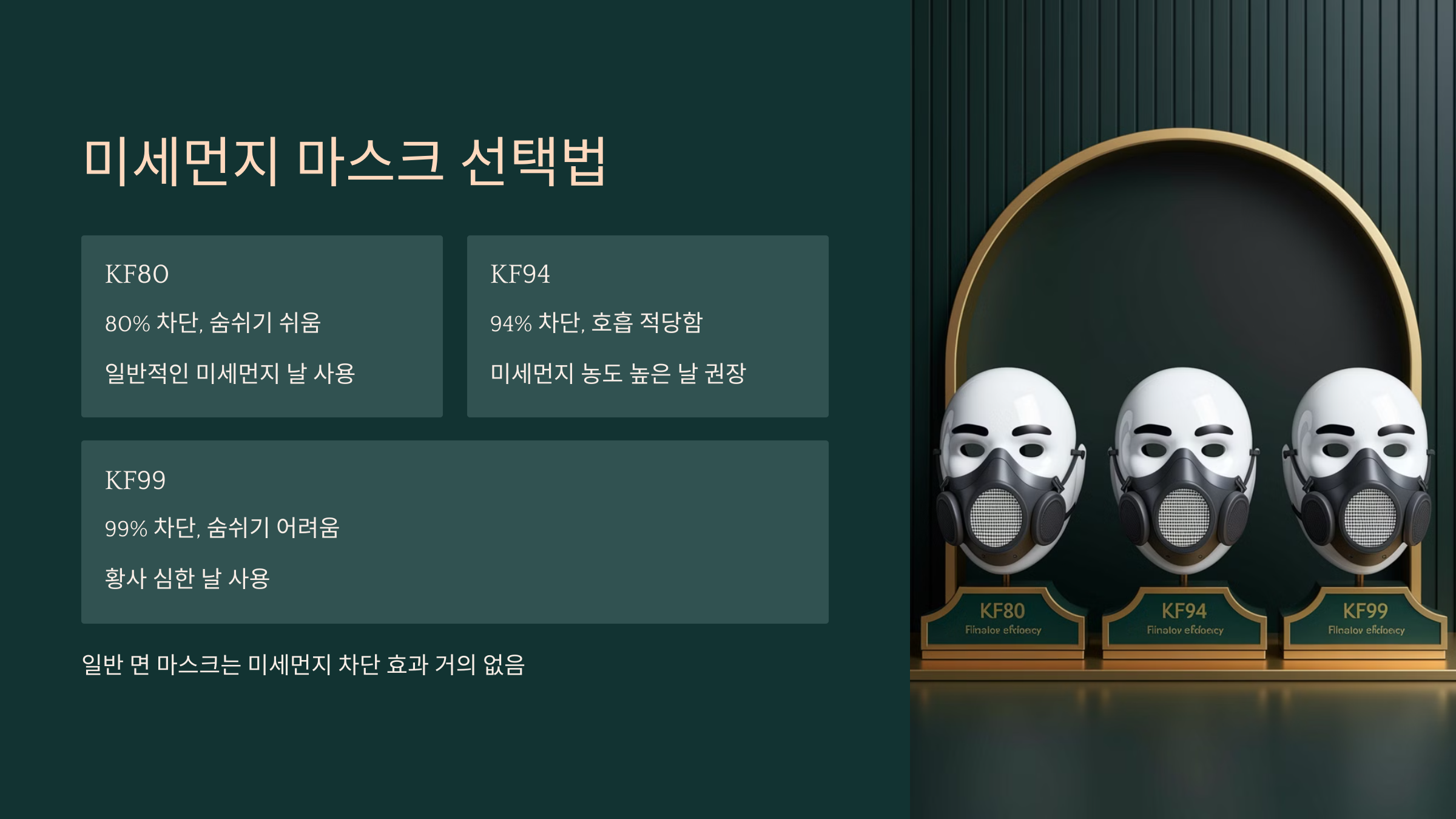 미세먼지를 차단하려면 적절한 마스크를 선택하는 것이 매우 중요해요. 일반 면 마스크는 미세먼지를 거의 걸러주지 못하기 때문에 반드시 KF 인증을 받은 제품을 사용해야 해요.