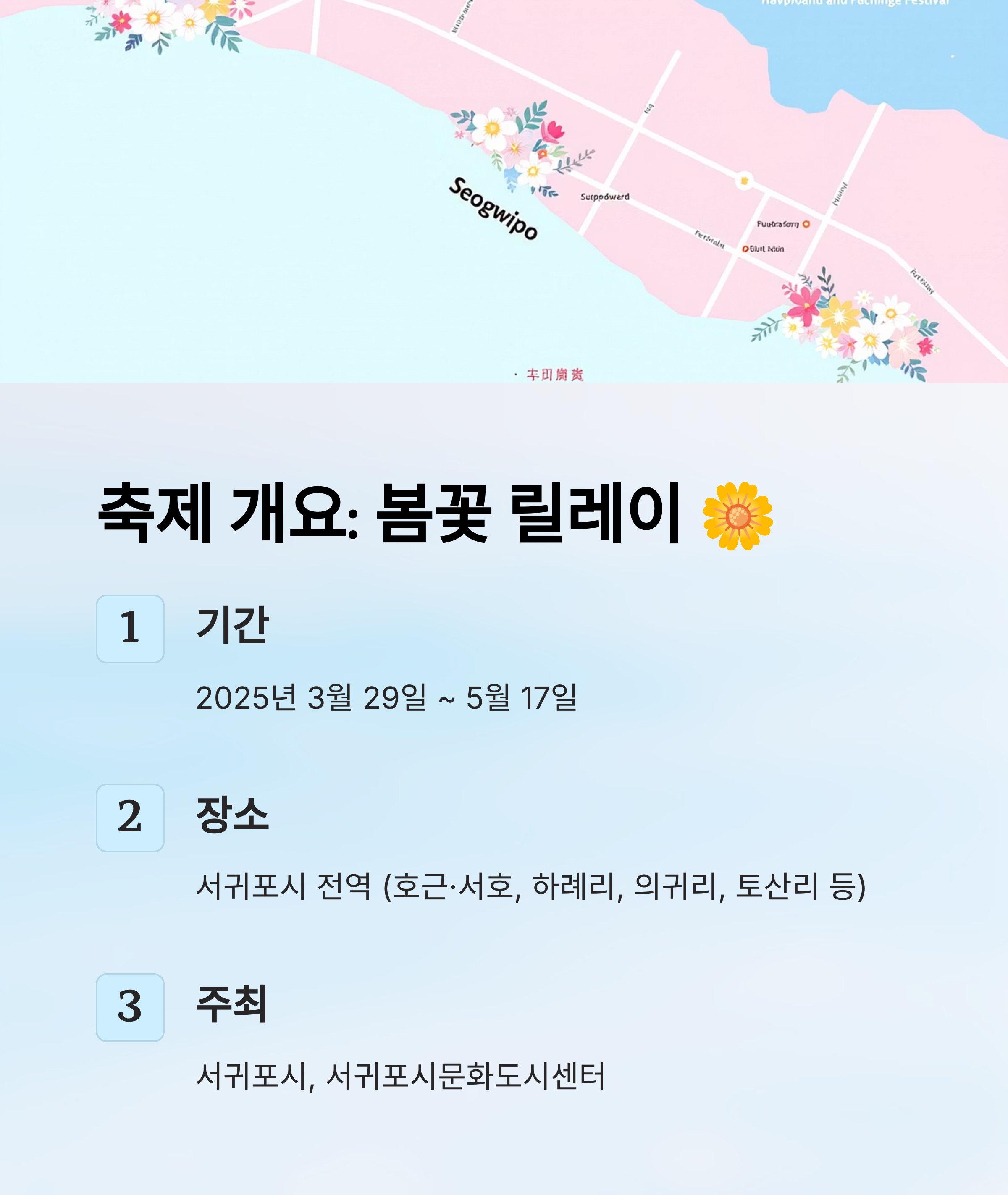 서귀포 곳곳의 자연, 문화, 공동체를 직접 만나면서, 제주의 진짜 매력을 피부로 느낄 수 있는 기회가 되는 거죠. 특히 플랫폼형 릴레이 방식은 한 장소에만 머무는 것이 아니라 다양한 마을을 여행하게 만들어 주기 때문에, 봄날의 제주를 훨씬 깊이 있게 경험할 수 있어요. 🌸