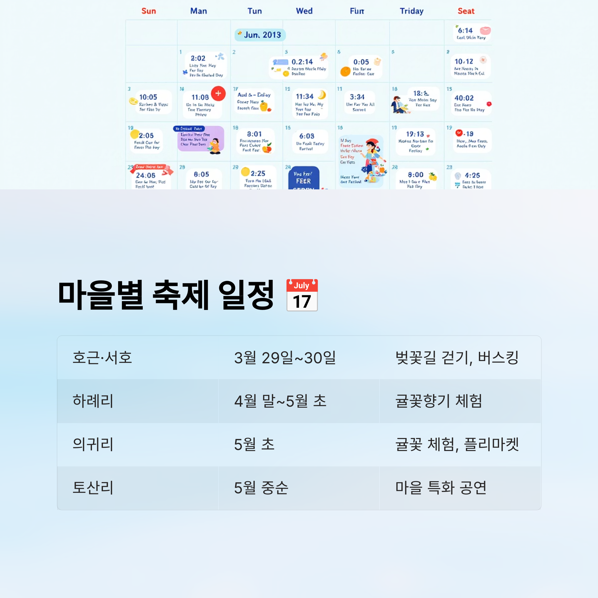 예를 들면, 호근·서호에서는 벚꽃길 걷기와 플리마켓이 펼쳐지고, 하례리에서는 귤꽃향기 체험이 진행되는 식으로, 각 마을마다 고유한 매력을 담아 축제를 이끌어가요.