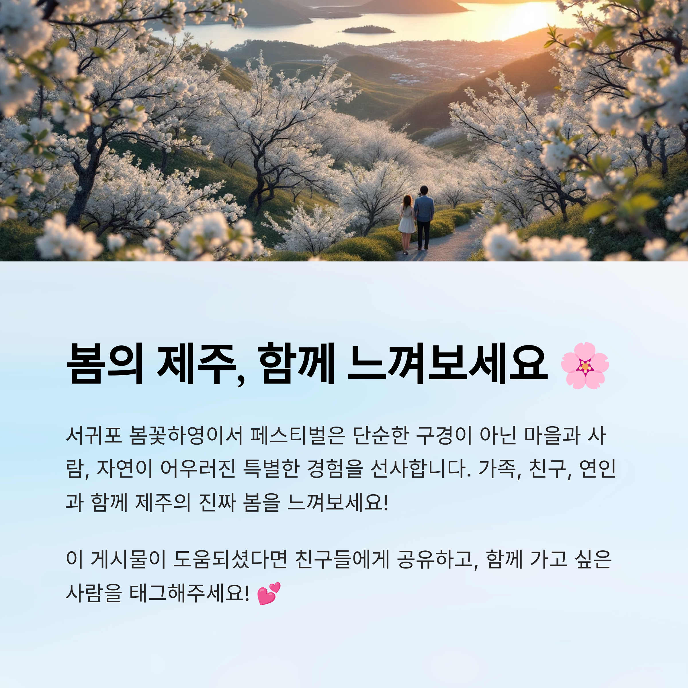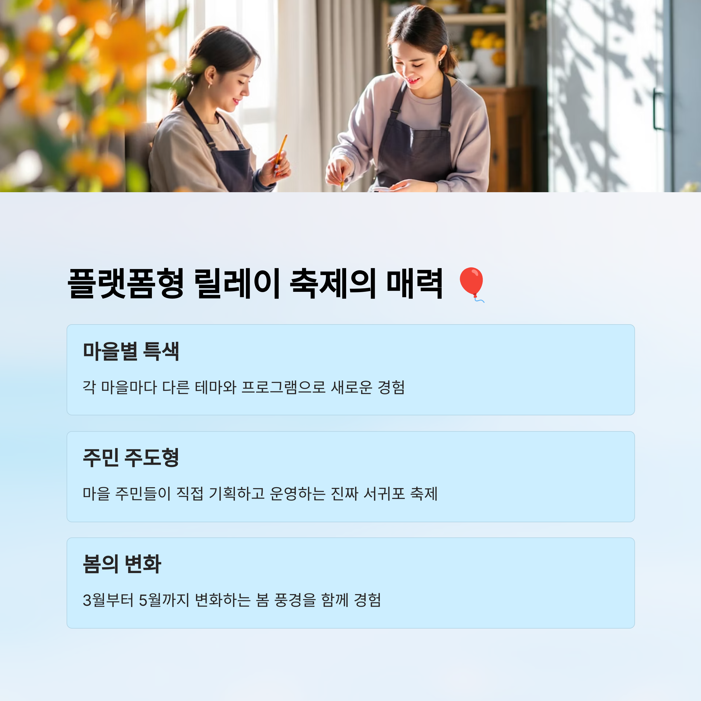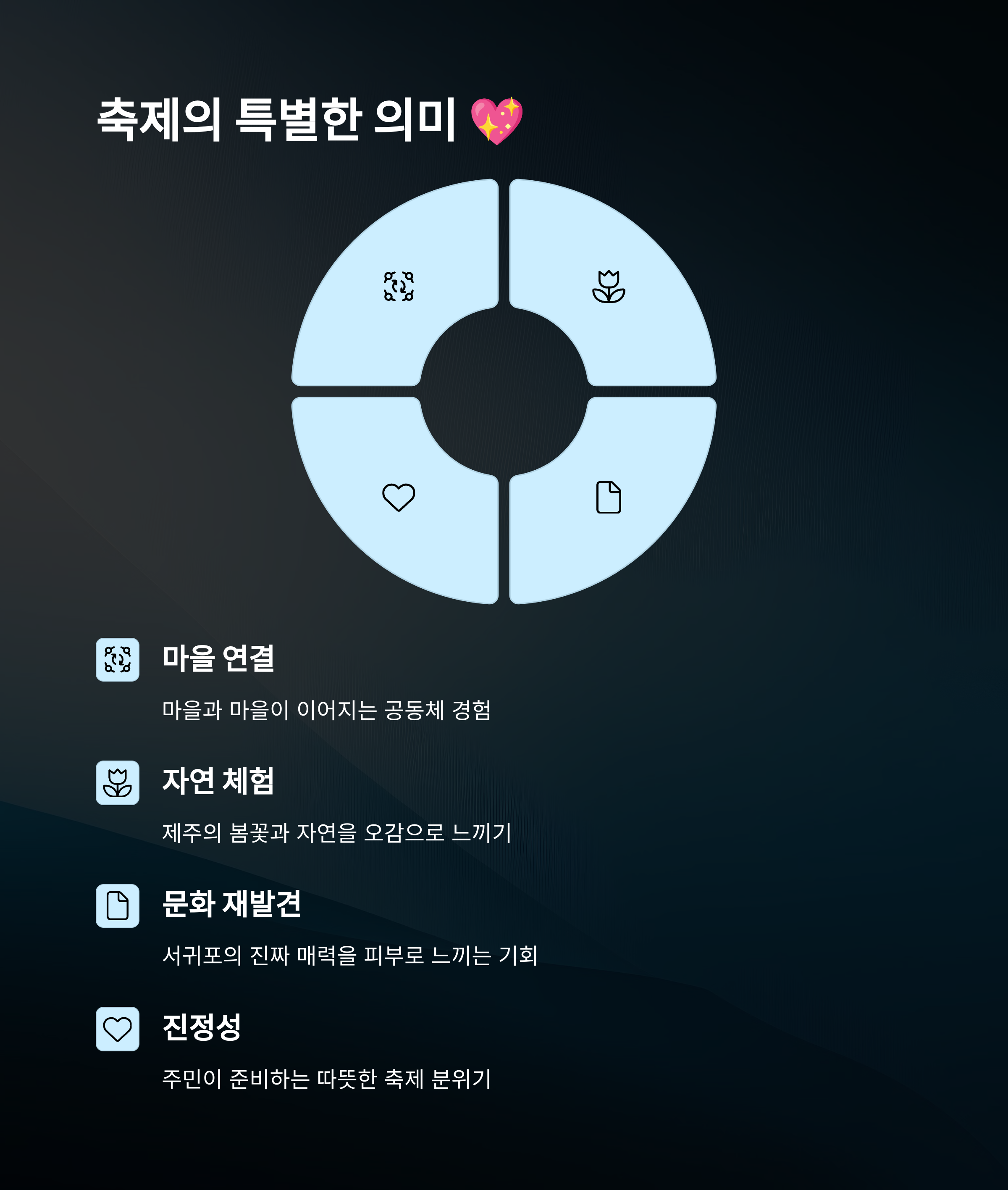 각 마을이 저마다의 색깔을 담은 프로그램을 준비하고, 아름다운 자연과 사람 냄새 나는 분위기까지 더해져서 그야말로 서귀포만의 봄을 오롯이 느낄 수 있답니다. 이거, 놓치면 너무 아쉬울 것 같아요!🌿