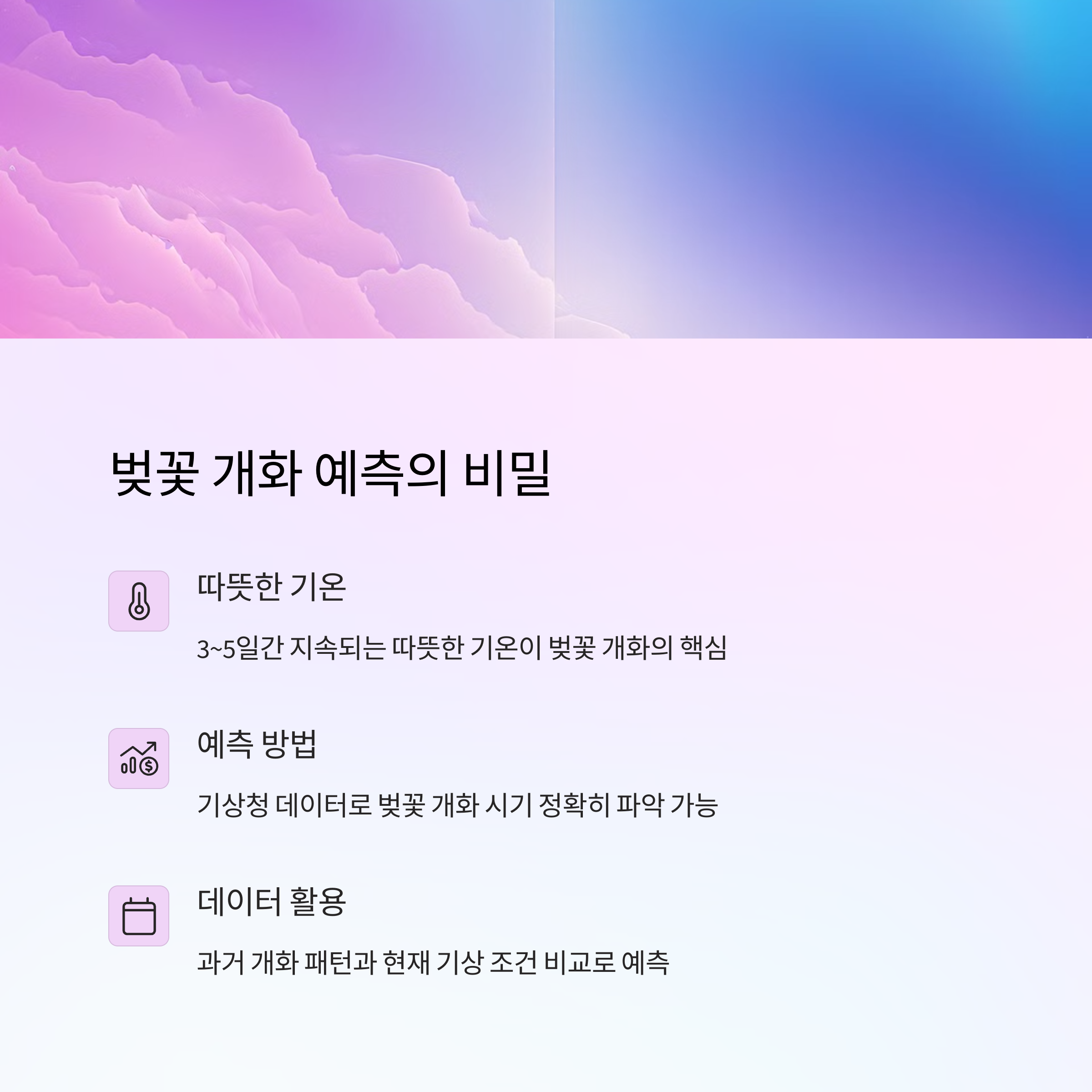 벚꽃 개화 시기를 정확하게 맞추는 건 생각보다 어려워요. 최근에는 AI 모델을 활용한 민간 예보도 등장했는데, 이를 통해 더 정밀한 지역별 개화 예측이 가능해지고 있답니다. 이처럼 벚꽃의 시작은 자연과 과학이 만나 만들어지는 작은 기적 같아요 😊