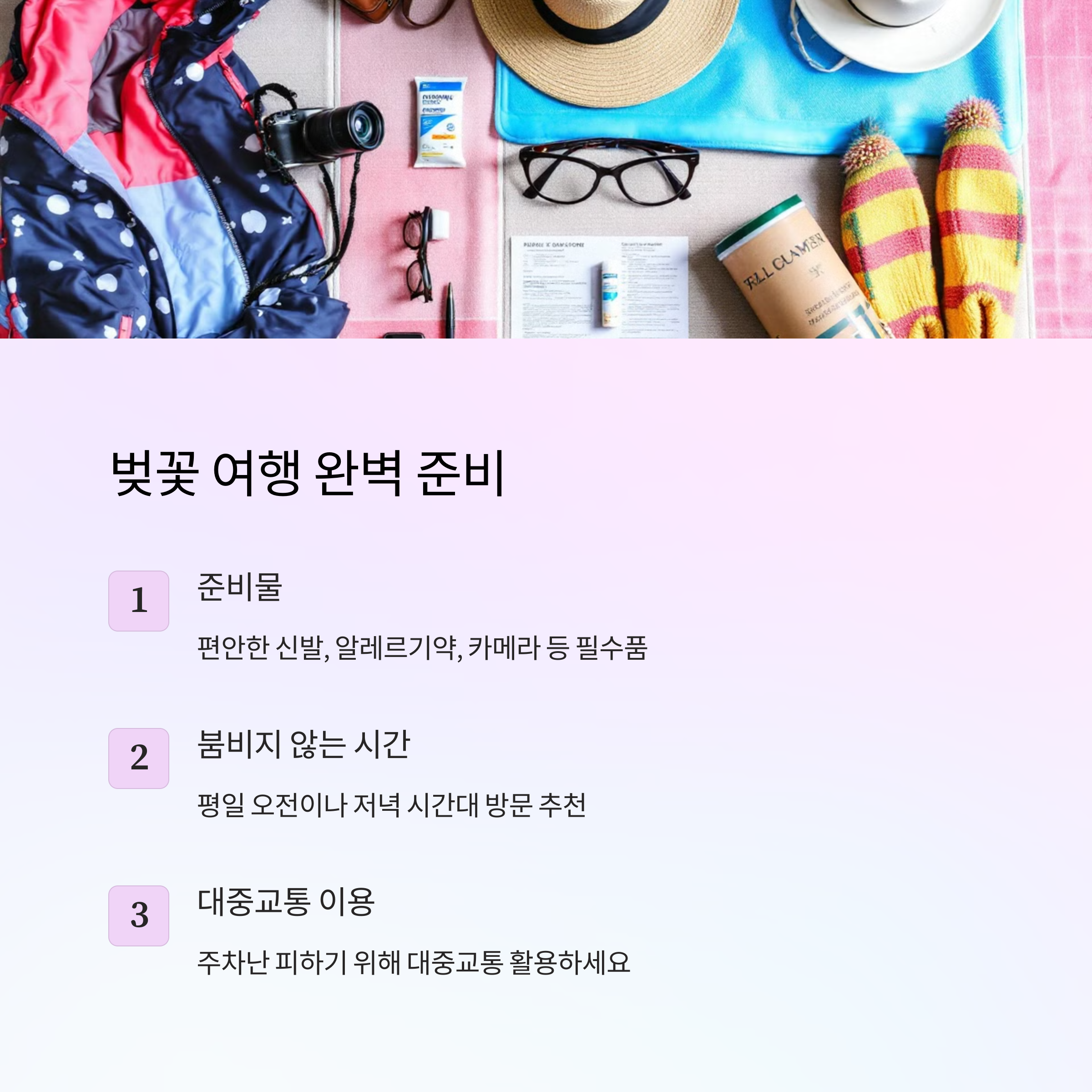 이제 벚꽃을 보러 갈 준비가 됐다면, 여행 팁도 몇 가지 알고 가면 훨씬 즐겁게 다녀올 수 있어요. 다음 섹션에서는 벚꽃 여행에 꼭 필요한 꿀팁들을 소개할게요!