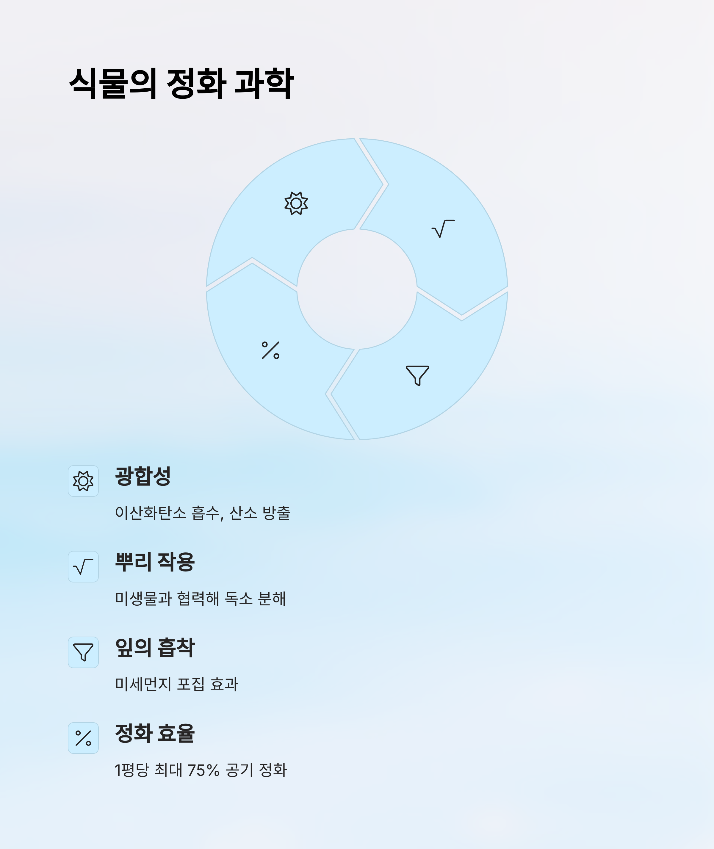 이런 오염 물질을 제거해주는 것이 바로 공기 정화 식물이랍니다. 식물은 광합성 작용뿐 아니라 뿌리와 잎의 미생물과 함께 복합적으로 정화 작용을 해요. 공기 속의 먼지나 유해 물질을 흡수하고, 산소를 배출해줘서 쾌적한 환경을 만들어 주죠.