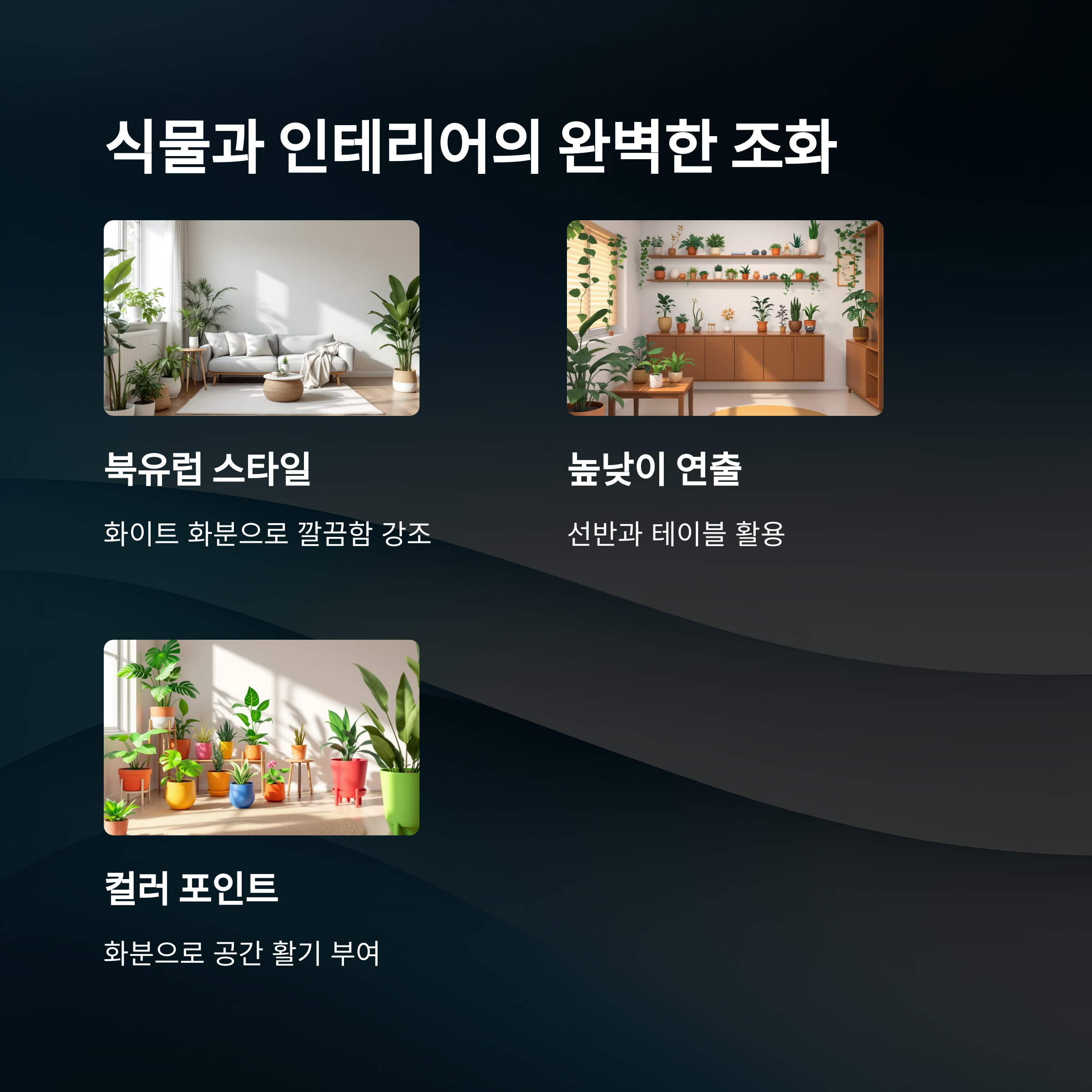식물을 인테리어 요소로 활용할 때는 '너무 과하지 않게' 배치하는 것이 포인트예요. 여백과 식물 사이의 조화를 생각해보세요.