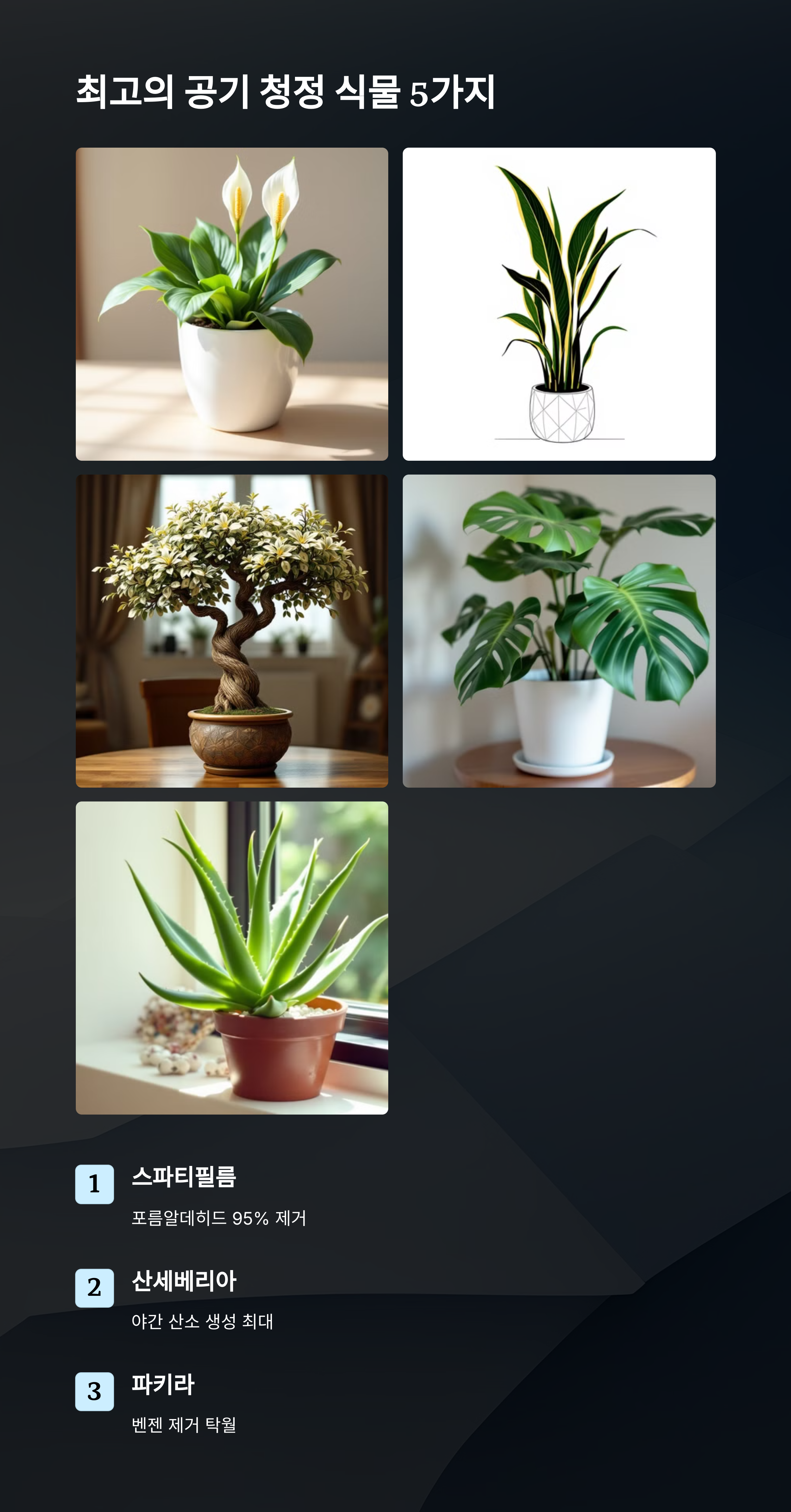 이 식물들은 모두 미세먼지나 휘발성 유기화합물(VOC)을 줄이는 데 효과가 입증된 친구들이에요. 알레르기나 천식이 있는 분들에게 특히 추천해요.