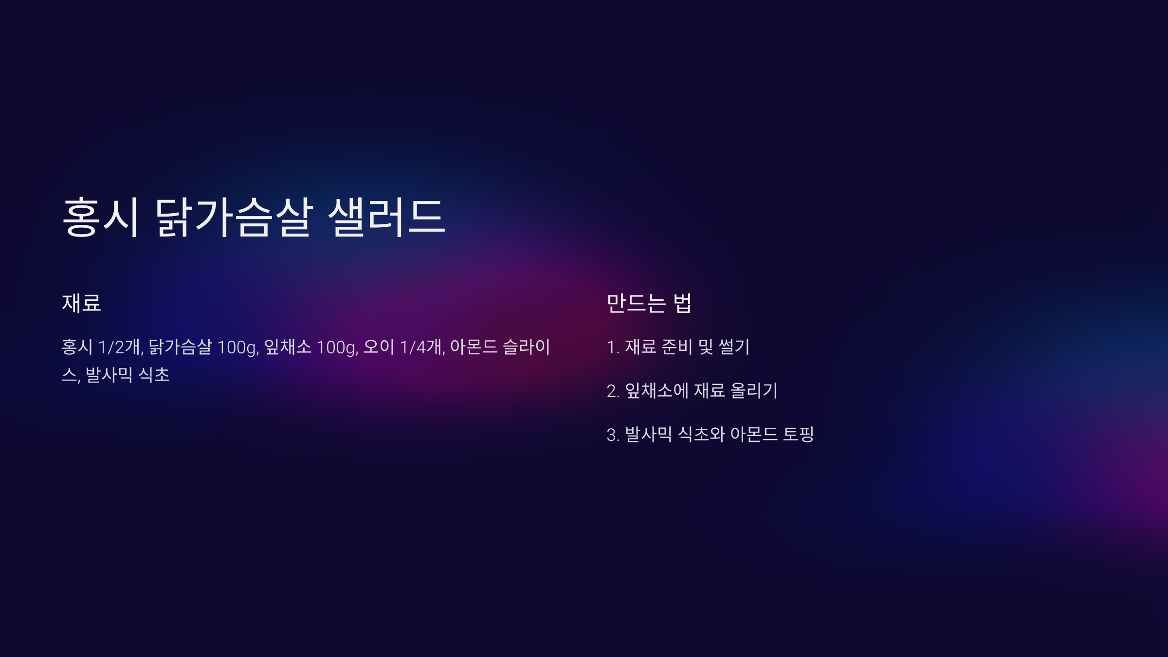 - 닭가슴살은 한입 크기로 찢고, 홍시와 오이는 얇게 슬라이스합니다.
