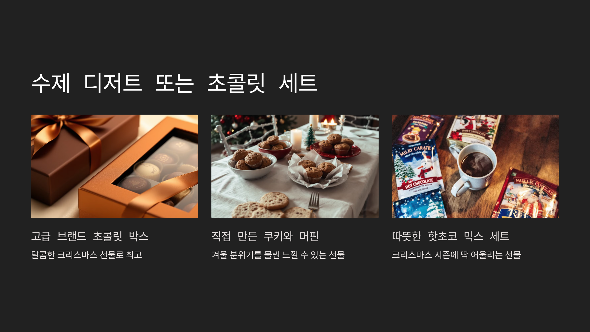 달콤한 디저트는 크리스마스 분위기를 더욱 돋웁니다. 맛있는 선물은 언제나 환영받죠! 🎂