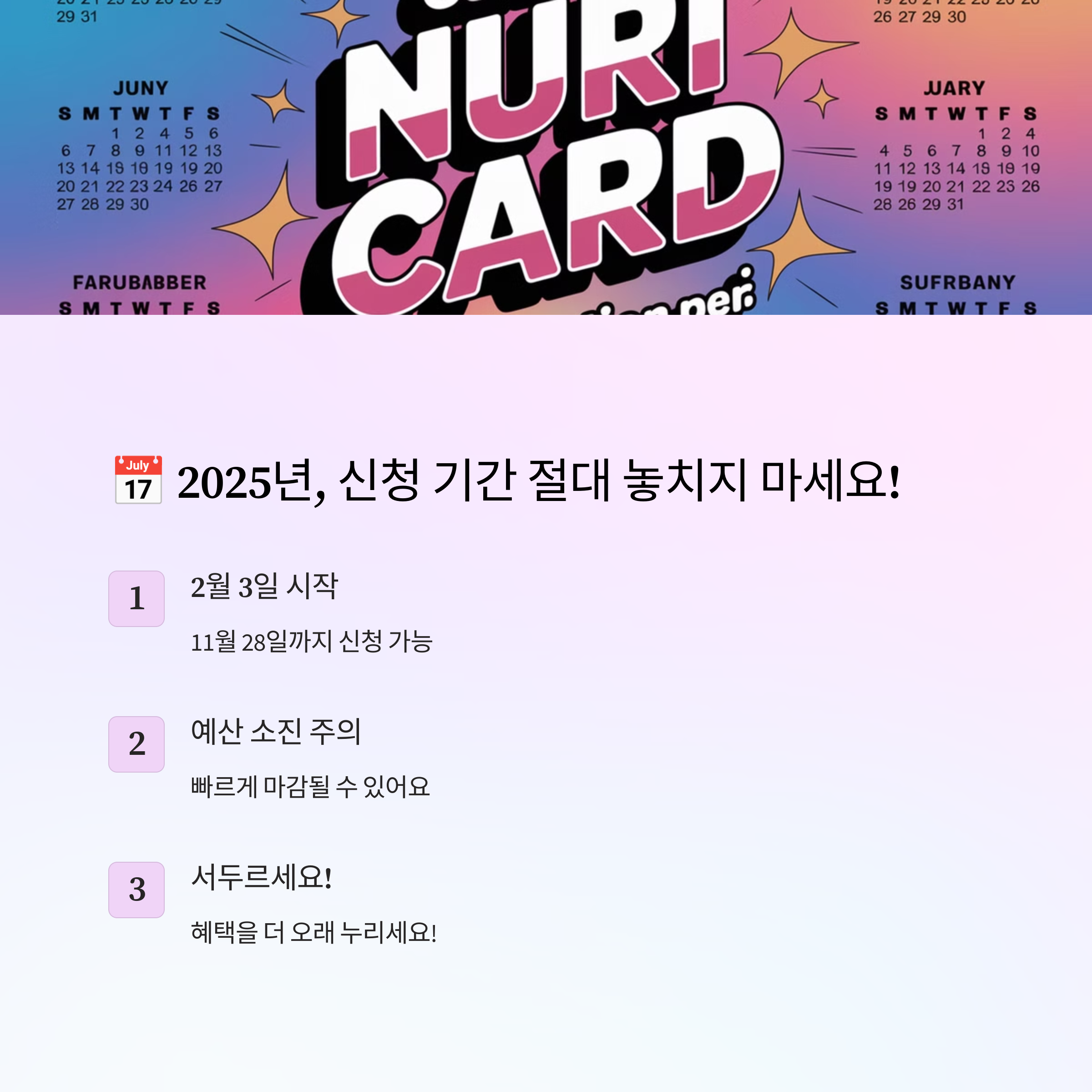 매년 초부터 신청이 가능하며, 선착순이 아니기 때문에 일정 기간 내에만 신청하면 누구나 혜택을 받을 수 있어요. 하지만, 빠르게 신청하면 카드 발급도 더 빨리 받을 수 있으니 서둘러 준비하는 게 좋아요! 🚀