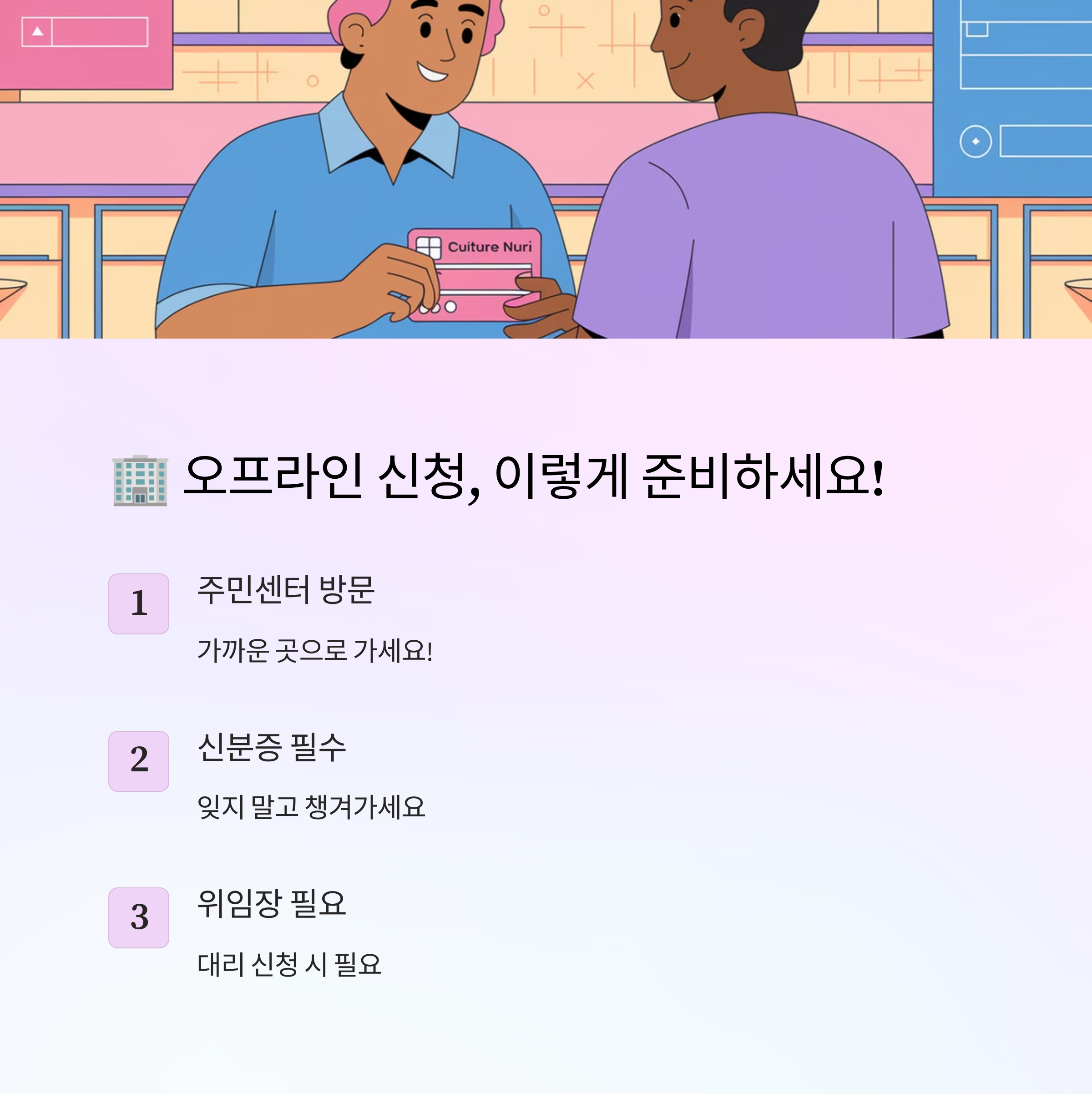오프라인 신청은 가까운 주민센터에서 할 수 있어요. 방문 신청 시 신분증을 꼭 지참하세요! 🏢