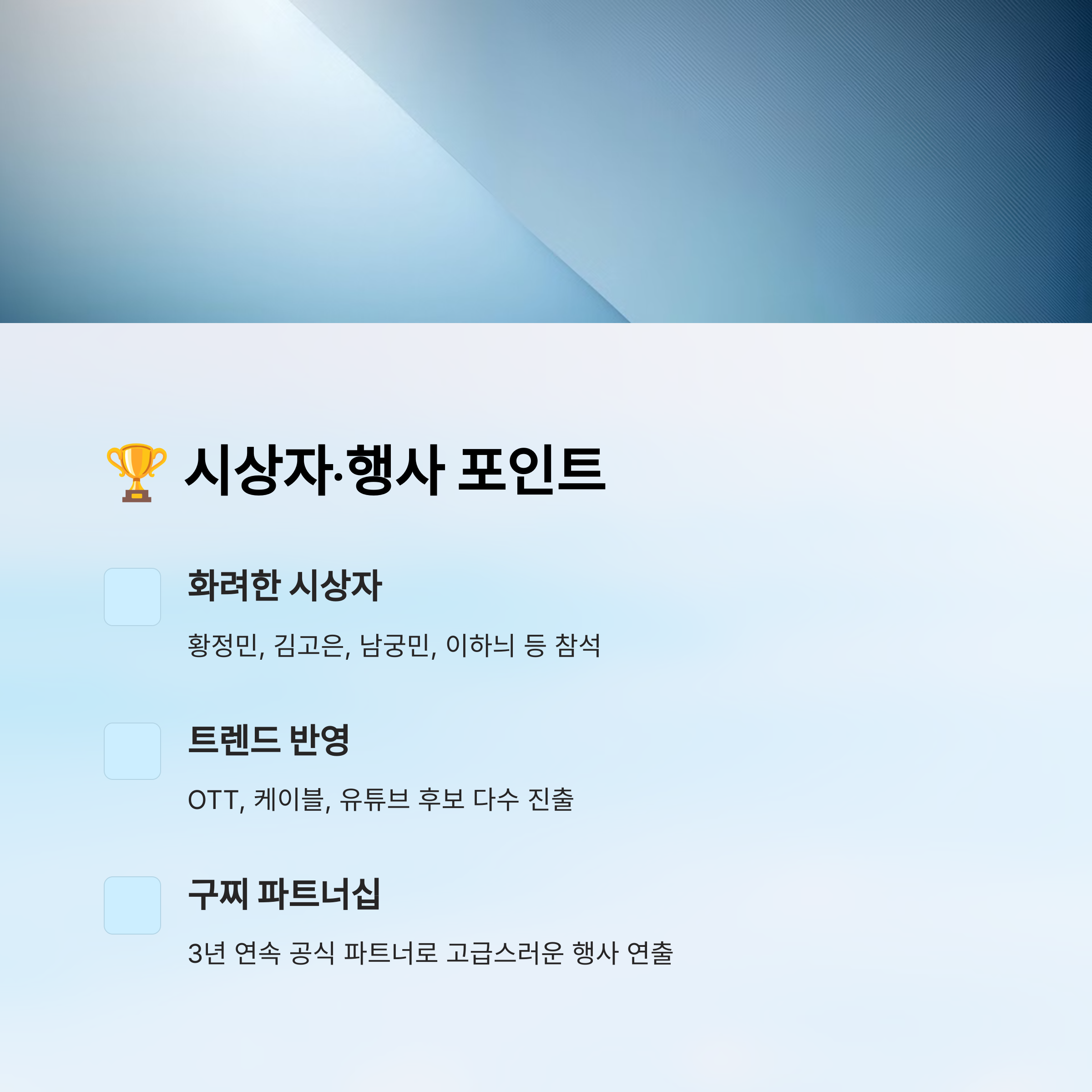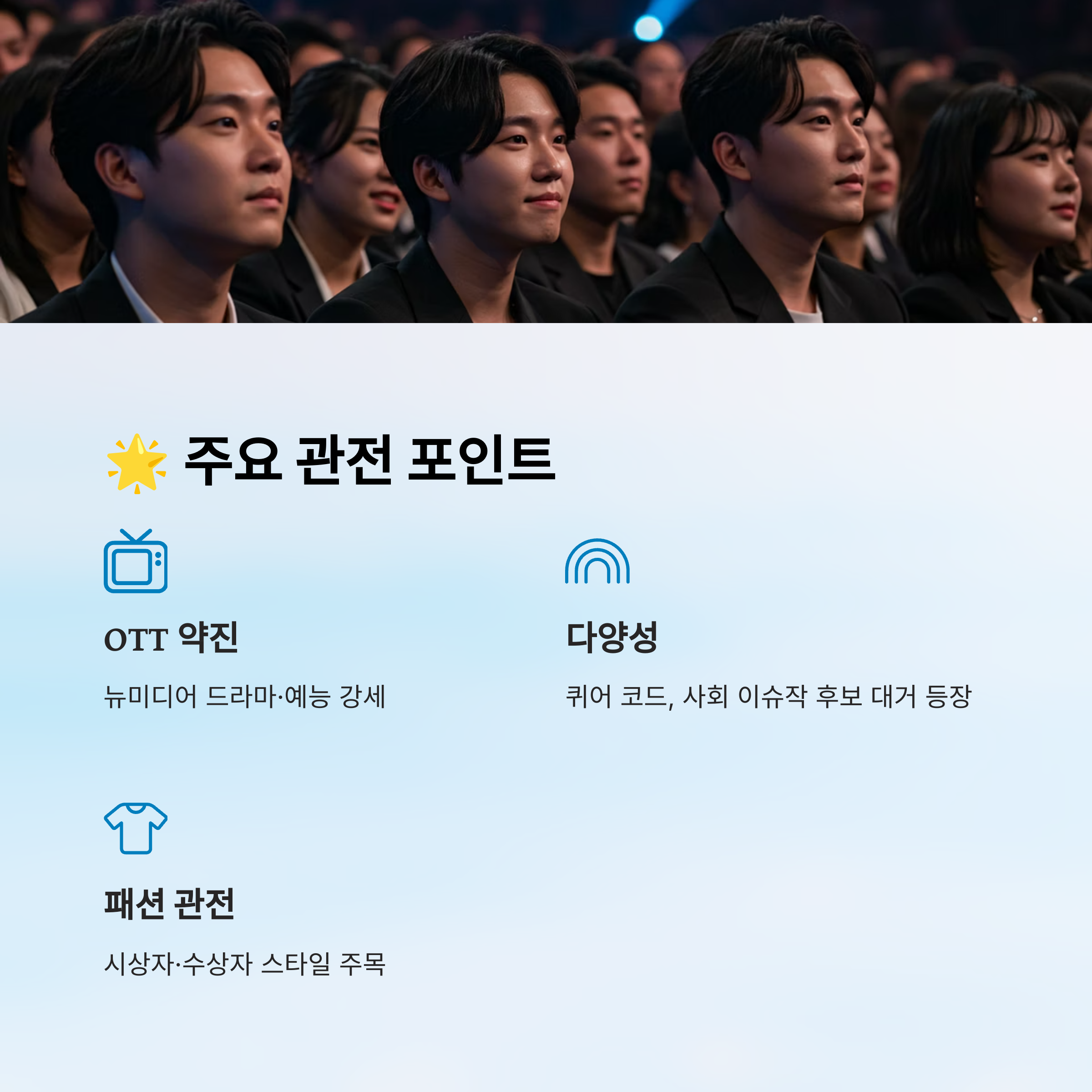 또한 다양한 플랫폼에서의 경계 없는 경쟁도 주목받고 있어요. 유튜브, OTT, 방송 3사가 함께 경쟁하는 구도는 과거에는 볼 수 없었던 장면이거든요. 이 흐름은 앞으로의 시상식 형식 자체를 변화시킬 가능성이 커 보여요.