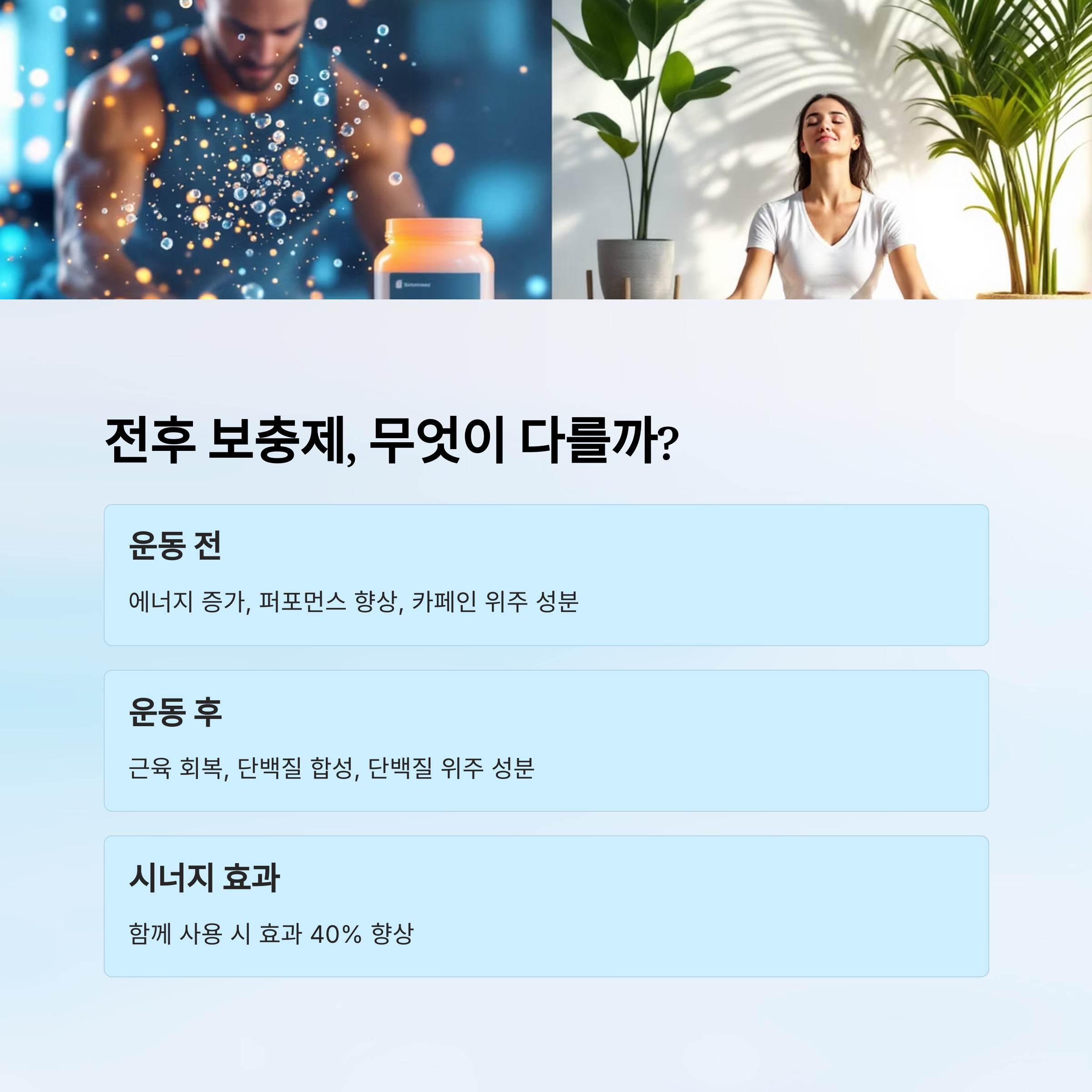 운동 전 보충제와 운동 후 보충제는 목적부터 성분, 복용 시점까지 완전히 달라요. 전자는 '운동을 잘 시작하고 잘 버티기 위한' 보조제고, 후자는 '운동 후 몸을 회복시키기 위한' 회복제에 가까워요.