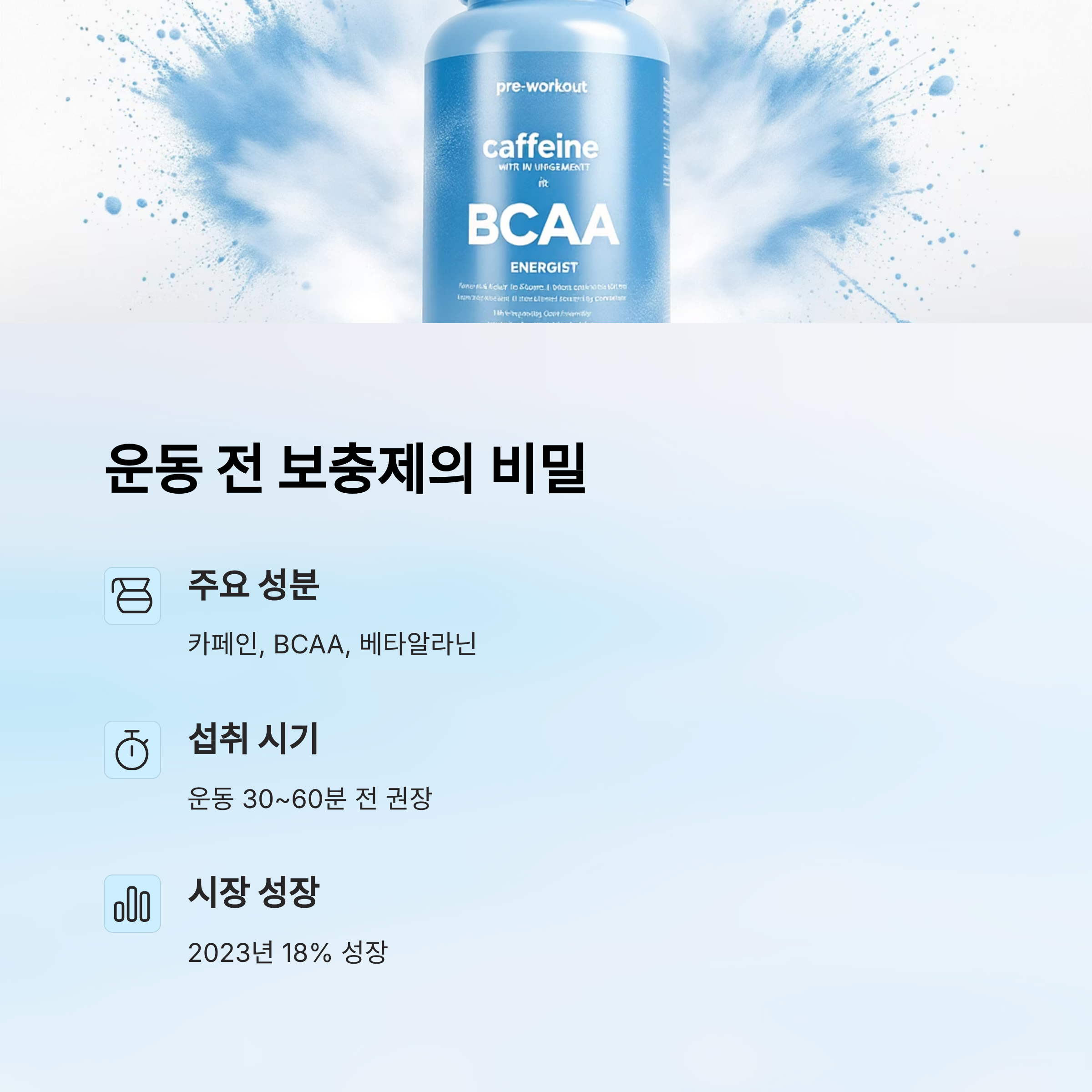 운동 전 보충제는 특히 집중이 잘 안 되거나, 아침 운동처럼 에너지가 부족한 상황에서 도움을 줘요. 평소보다 더 힘을 내고 싶을 때 강력한 서포트가 돼준다고 할 수 있어요 💪