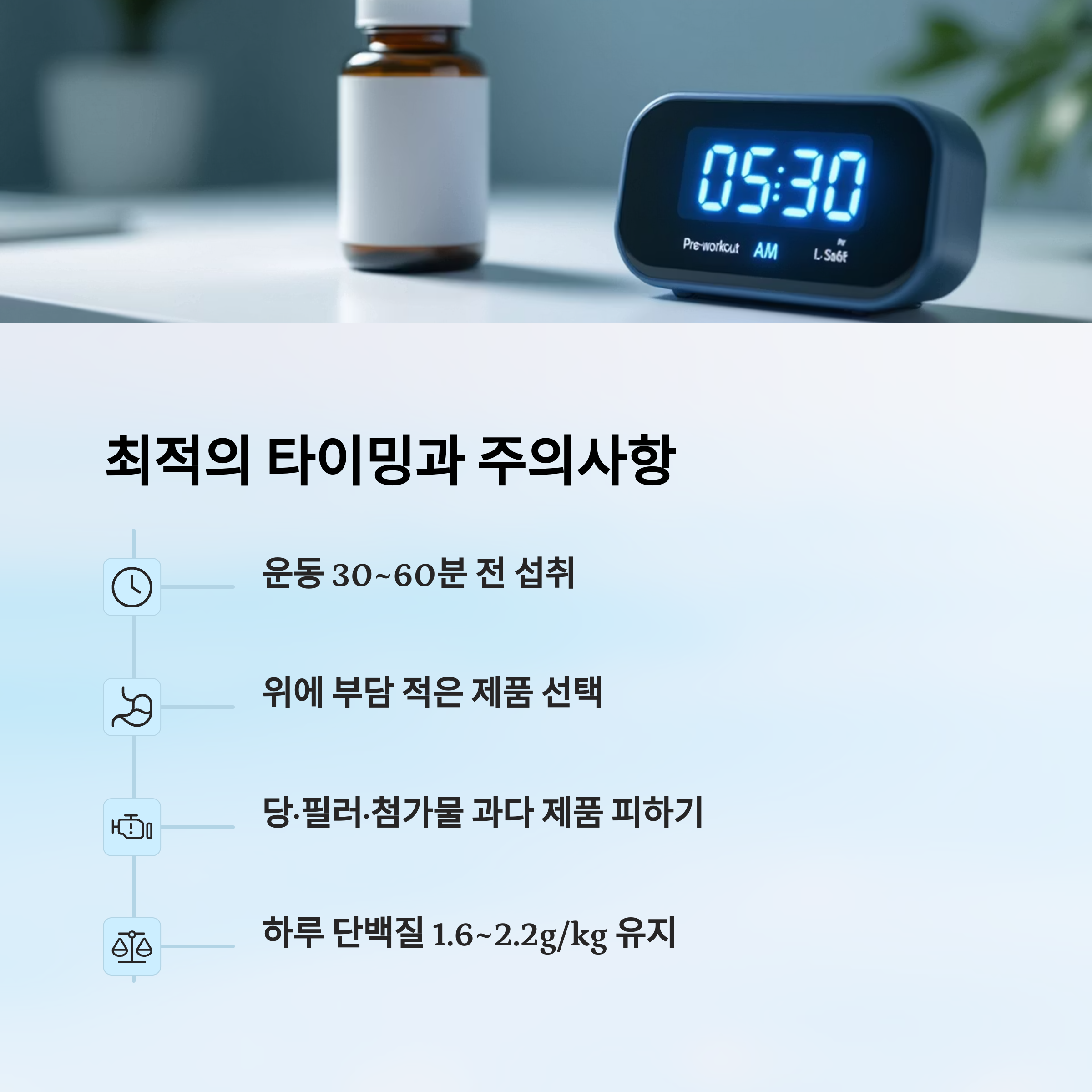 주의해야 할 점도 있어요. 공복에 자극형 프리워크아웃을 마시면 속쓰림이나 심장 두근거림이 올 수 있어요. 민감한 분들은 공복을 피하거나, 무자극 제품부터 시작하는 걸 추천해요.