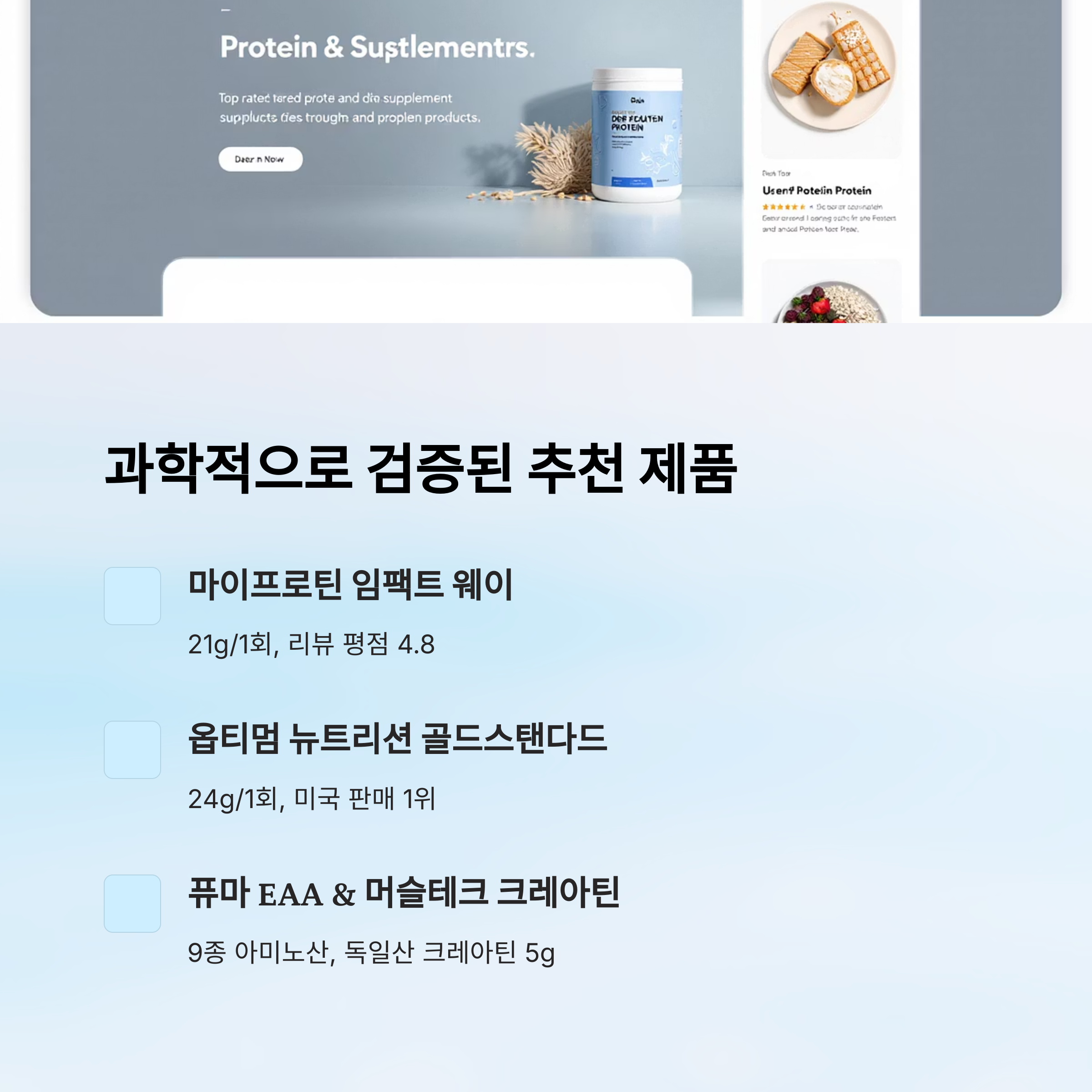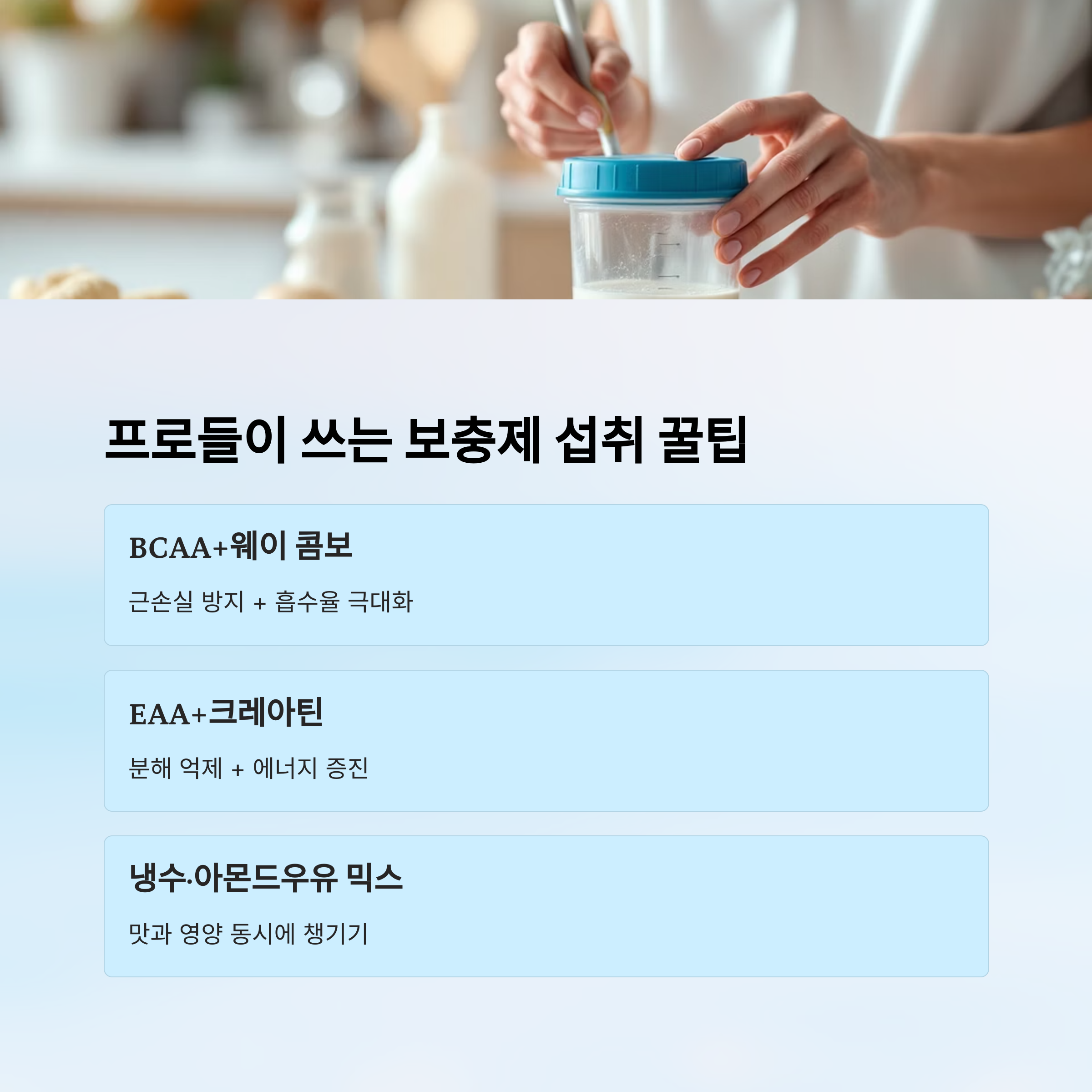아침 공복 운동 시엔 무자극 단백질만 섭취해도 되고, 오후 고강도 운동이라면 프리워크아웃+단백질+BCAA 조합도 좋아요. 상황에 맞춰 조절하면 돼요!