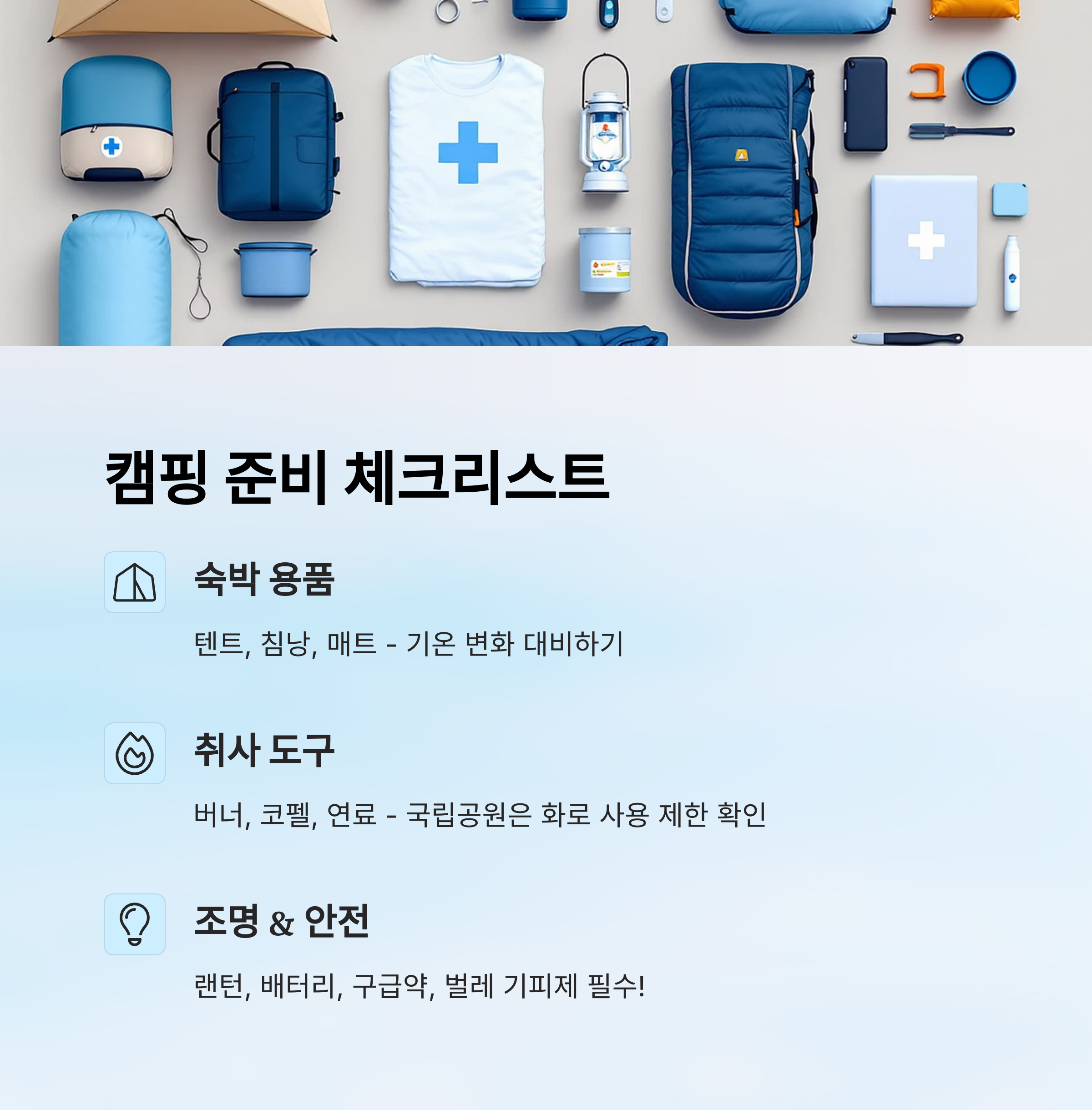 캠핑장에서 당황하지 않으려면 미리 체크해야 할 것들이 있어요. 캠핑 경험을 완벽하게 만들어 줄 필수 준비 리스트를 확인해 보세요! ✅