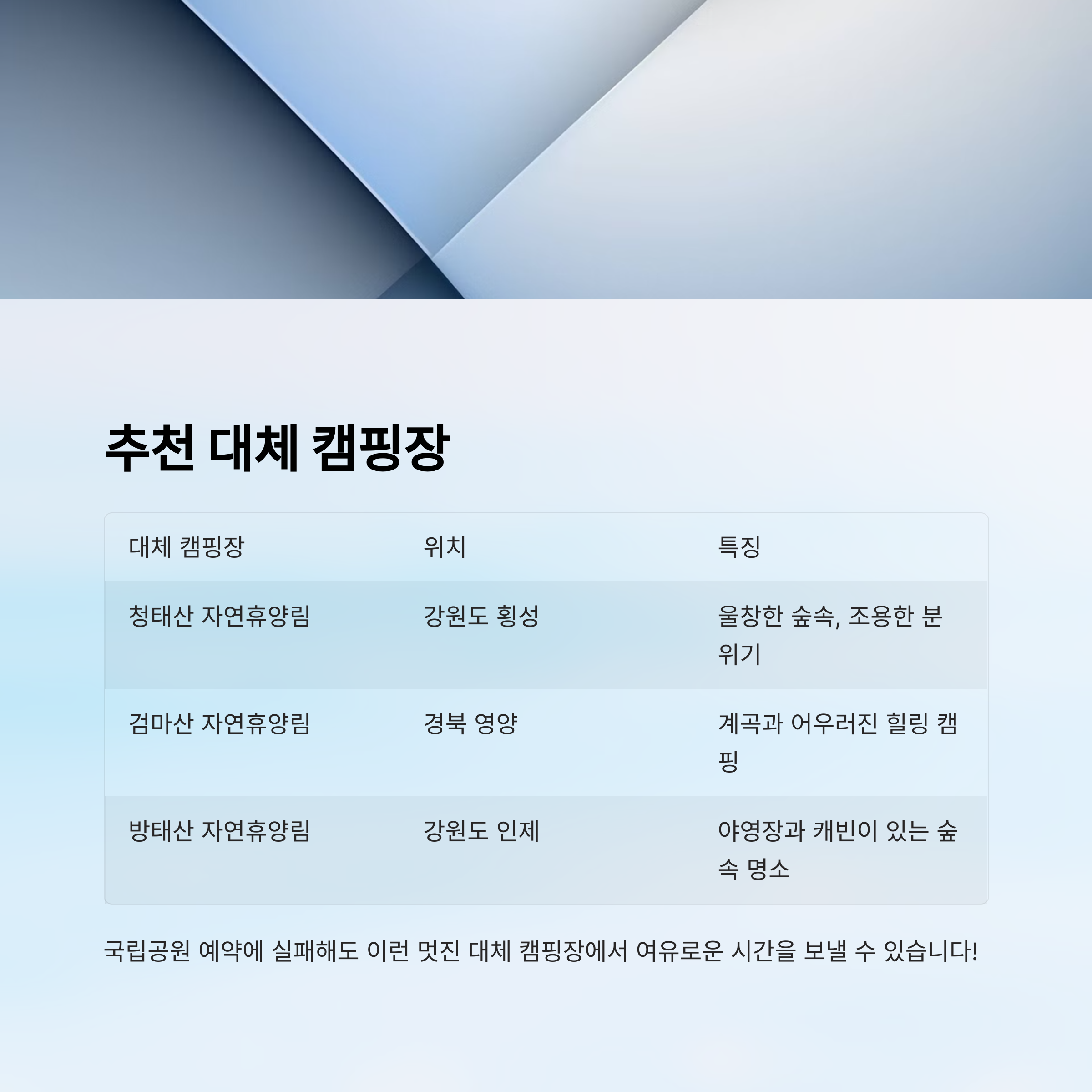 걱정하지 마세요! 국립공원 캠핑장이 전부가 아니에요. 예약 경쟁이 심한 곳을 피하고도 멋진 자연 속에서 캠핑을 즐길 수 있는 대체 캠핑장 & 숨은 명소가 많아요. 🏕️