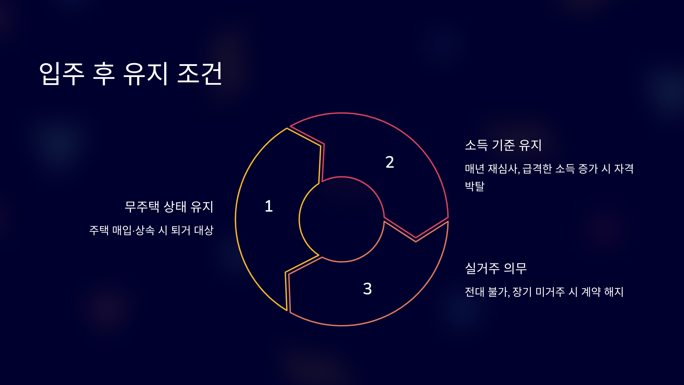| 무주택 상태 유지 | 입주 후에도 주택을 소유하면 안 됨 | 퇴거 조치 |